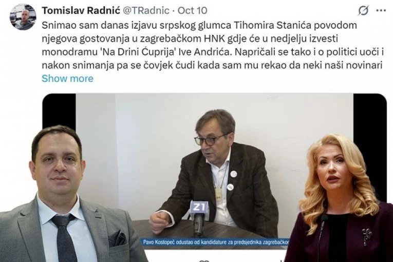 Glumac Tihomir Stanić boravio je u Zagrebu, gde je u Hrvatskom narodnom kazalištu izveo monodramu "Na Drini ćuprija" Iva Andrića. Ali tu priliku iskoristio je da iz Lijepe njihove ocrni sopstvenu državu.