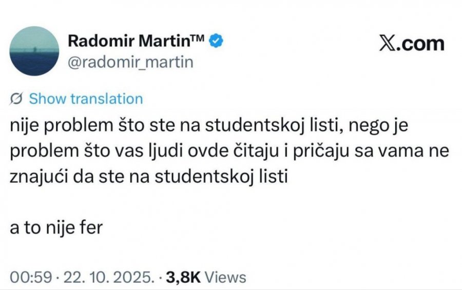 - Nije problem što ste na studentskoj listi, nego je problem što vas ljudi ovde čitaju i pričaju sa vama ne znajući da ste na studentskoj listi, a to nije fer - napisao je blokader Martin na Iksu.