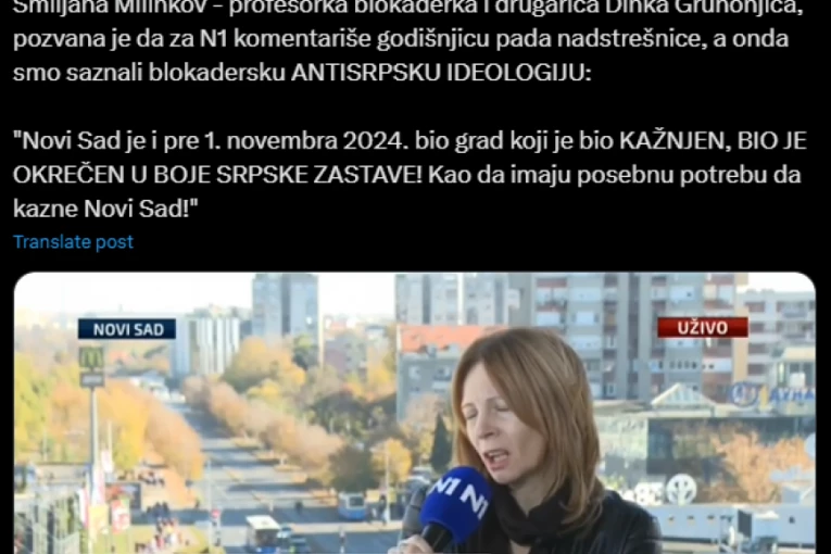 Smiljana Milinkov, profesorka blokaderka i drugarica Dinka Gruhonjića, pozvana je da za N1 komentariše godišnjicu pada nadstrešnice, a onda smo saznali blokadersku anstisprsku ideologiju.