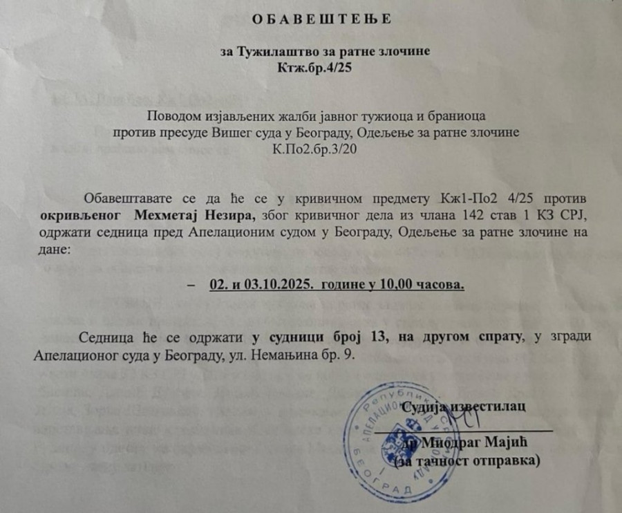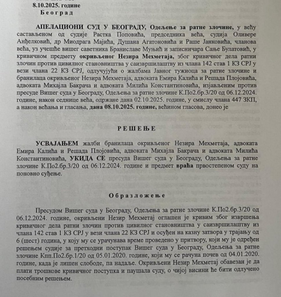 Odluka je doneta većinom glasova trojice sudija Apelacionog suda u Beogradu.