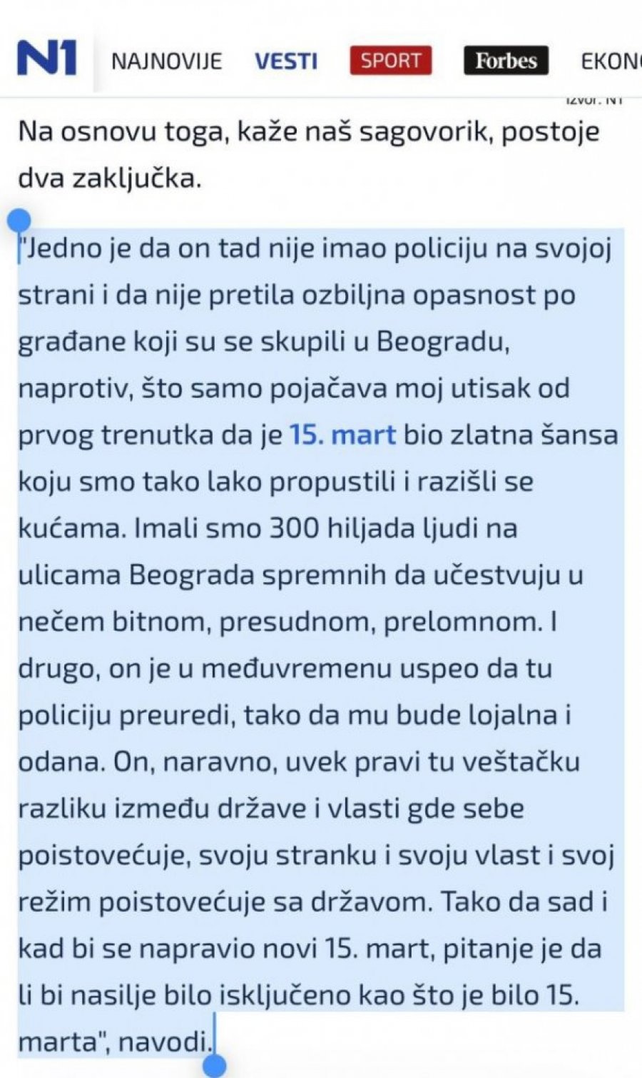 - Imali smo 300 hiljada ljudi na ulicama Beograda spremnih da učestvuju u nečem bitnom, presudnom, prelomnom - rekao je on i dodao da "i kad bi se sad napravio novi 15. mart, pitanje je da li bi nasilje bilo isključeno".