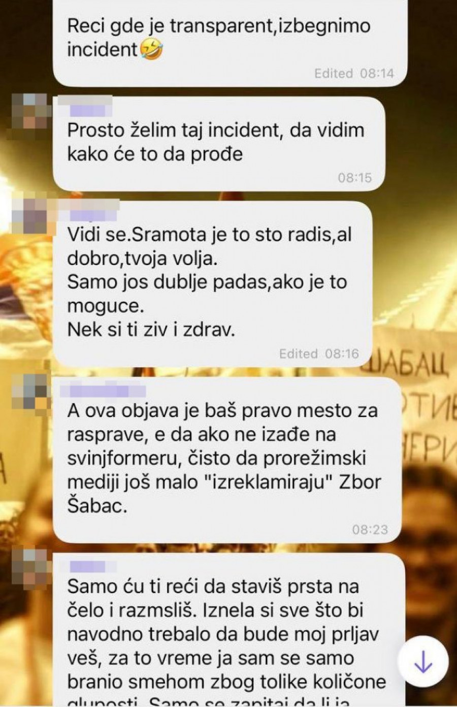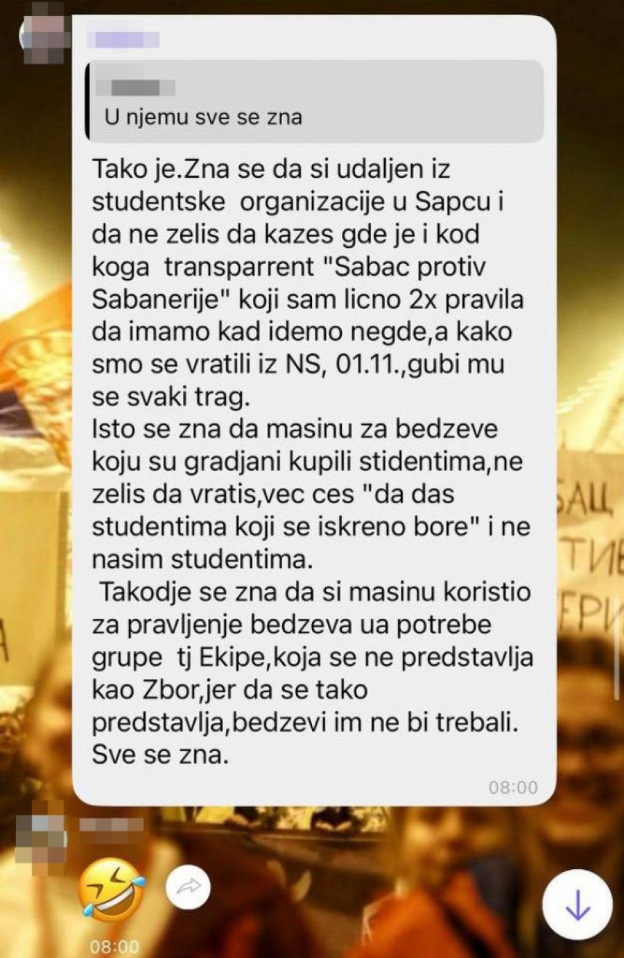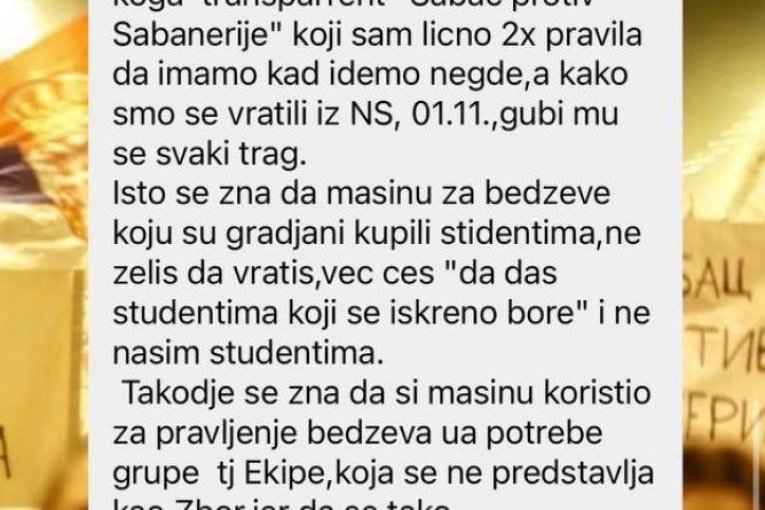 Najnoviji primer potpunog rasula vidi se na grupi „Zbor Šabac“, gde su ponovo izbila žestoka prepucavanja među samim blokaderima. Iako ovo nije prvi put da se u toj grupi vode javne čarke, o čemu smo već pisali, sada je situacija otišla korak dalje. Umesto da se bave, kako sami tvrde, „borbom za ideale“, članovi su se okrenuli jedni protiv drugih, optužujući se ko je sakrio transparent, ko je iznosio „prljav veš“ u javnost i ko radi protiv sopstvenih saboraca.