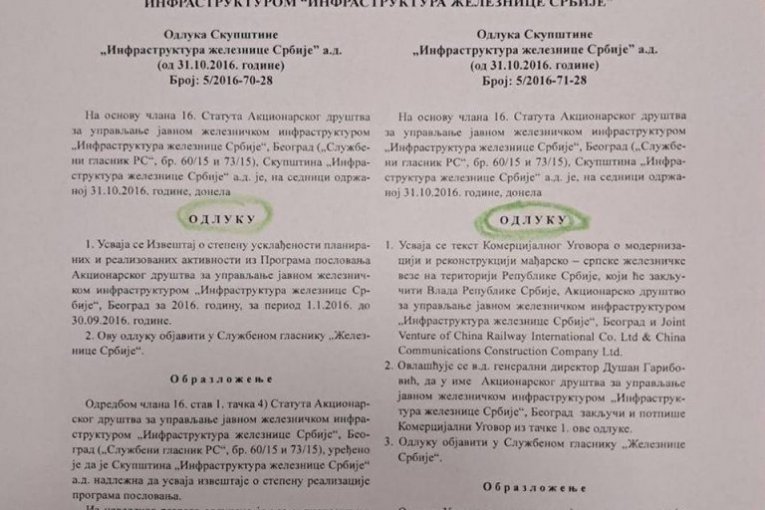Uzbunjivači iz kompanije Infrastruktura železnice Srbije dostavili su mi Odluku Skupštine akcionara kompanije Infrastruktura Železnica Srbije broj 5/2016-71/28 koja je doneta 31. oktobra 2016. godine, a koju je potpisao predsednik ovog organa Nebojša Bojović, Đokićev prorektor i drug tužioca organizovanog kriminala Mladena Nenadića.