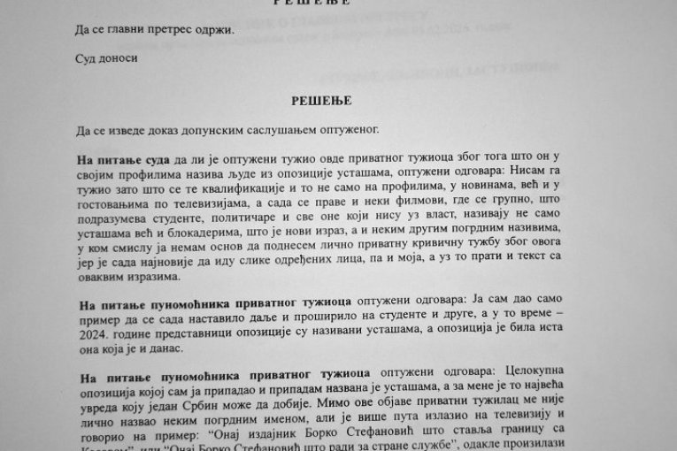 Bila je to samo kap koja je prelila čašu. Da sve ne prepričavamo, pomenimo i kako je Stefanović bio izričit da Milovanović nije njega lično nikad nazvao nekim pogrdnim imenom, pa da ga je zbog toga izvređao, već se njegova reakcija odnosi na Milovanovićeve ocene o celoj opoziciji. Pominje onda neke izjave Milovanovića iz 2021, a kada ovaj postavlja logično pitanje zašto ga onda nije tužio 2021, sudija donosi rešenje kojim ovo pitanje zabranjuje. Da, dobro ste pročitali: ZABRANJUJE.