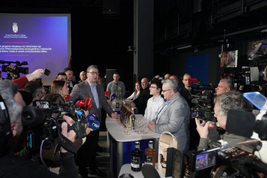 Predsednik Srbije Aleksandar Vučić prisustvovao je u Ložionici svečanoj ceremoniji uručenja rešenja u okviru programa za podsticaj razvoja prerađivačkih kapaciteta u oblasti proizvodnje vina, piva i jakih alkoholnih pića u 2025. godini.