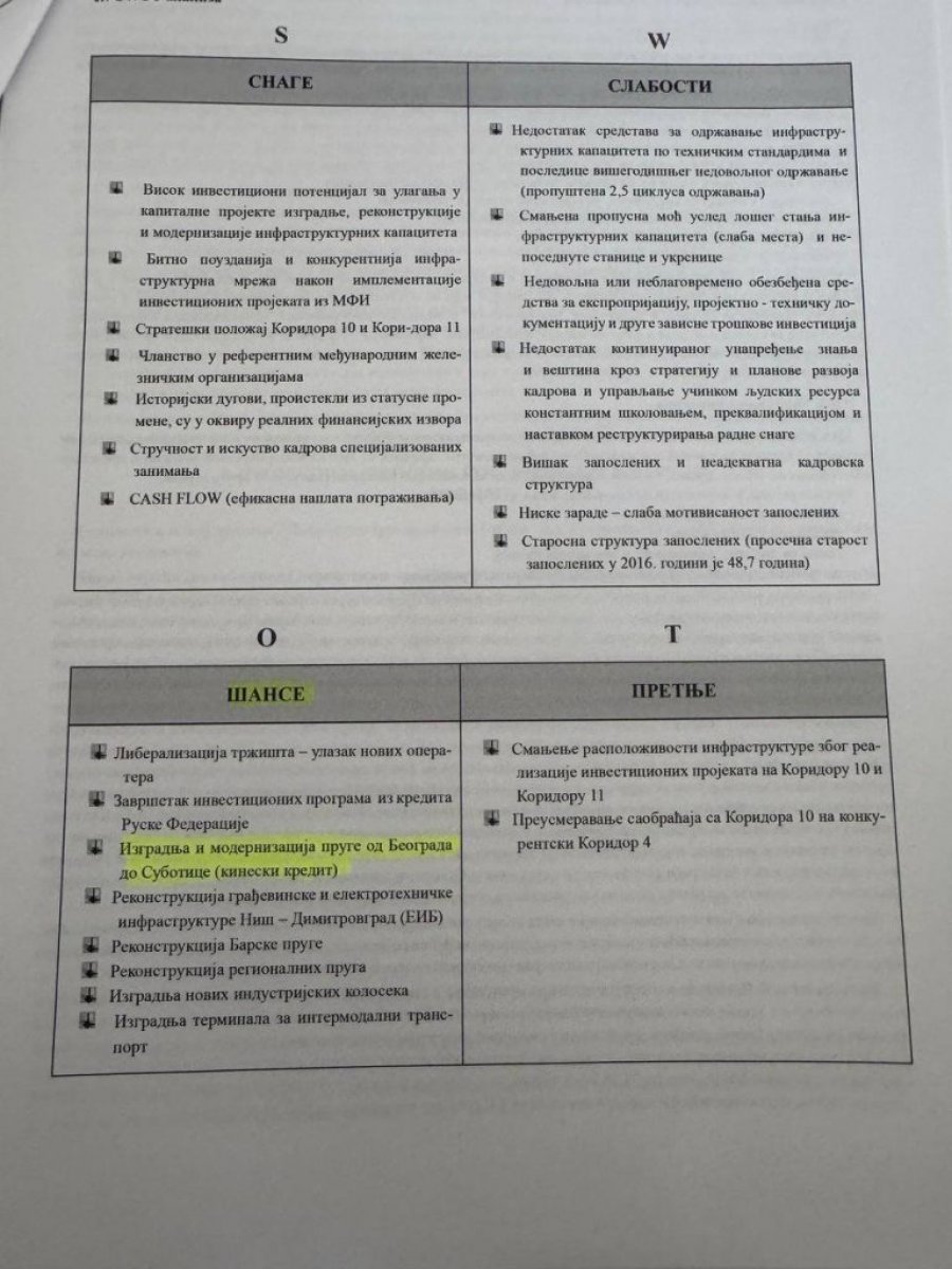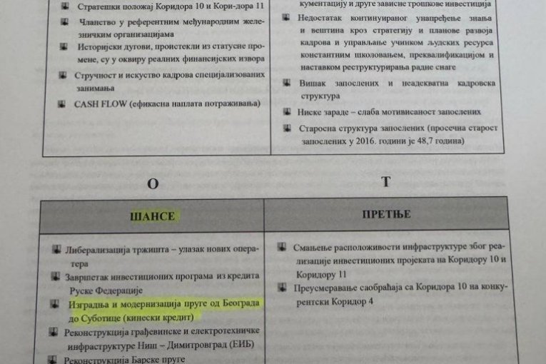 Bojović je u Planu definisao „izgradnju i modernizaciju pruge od Beograda do Subotice“ za koju je definisao da će se finansirati iz „kineskog kredita“ kao šansu za razvoj kompanije.