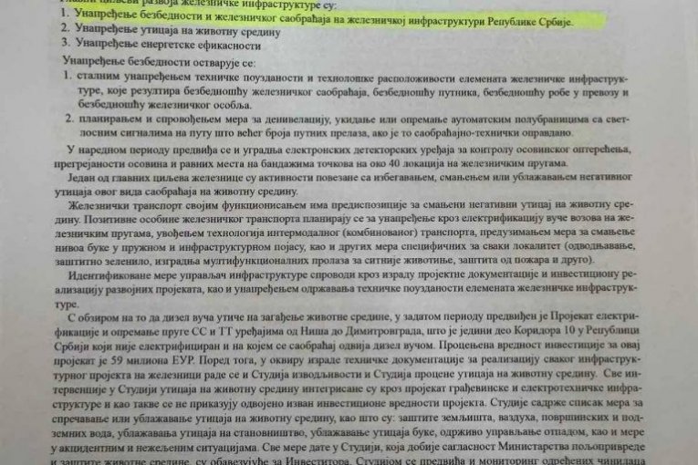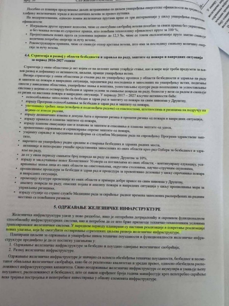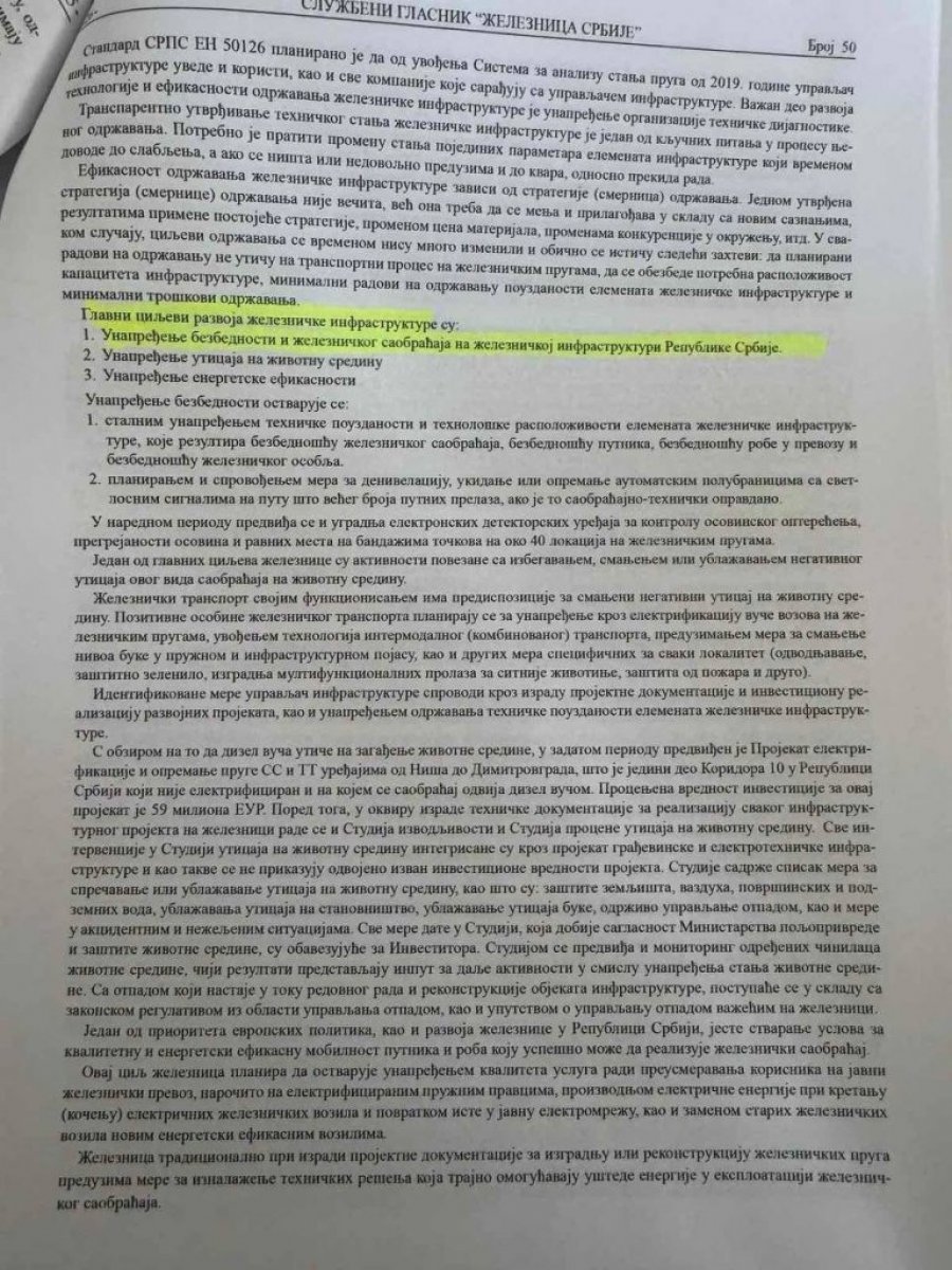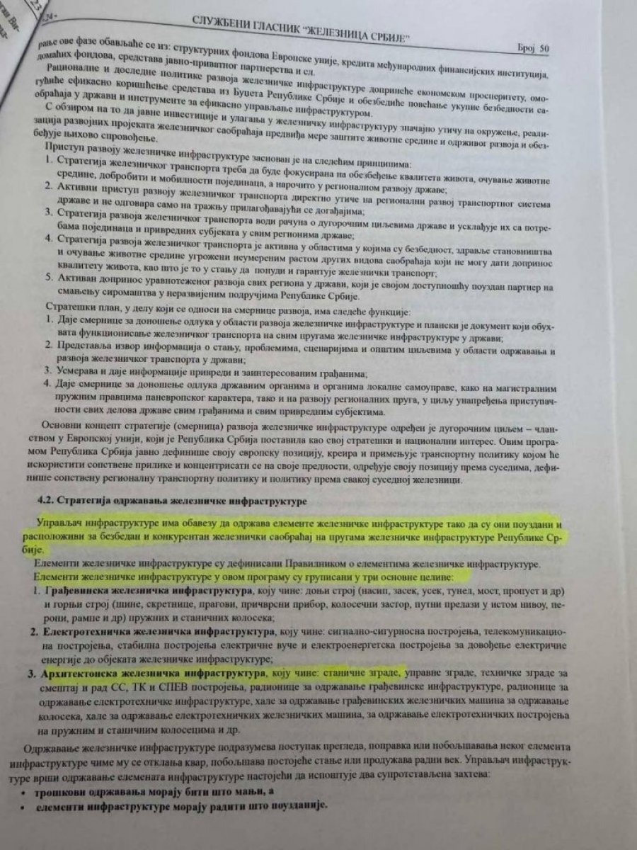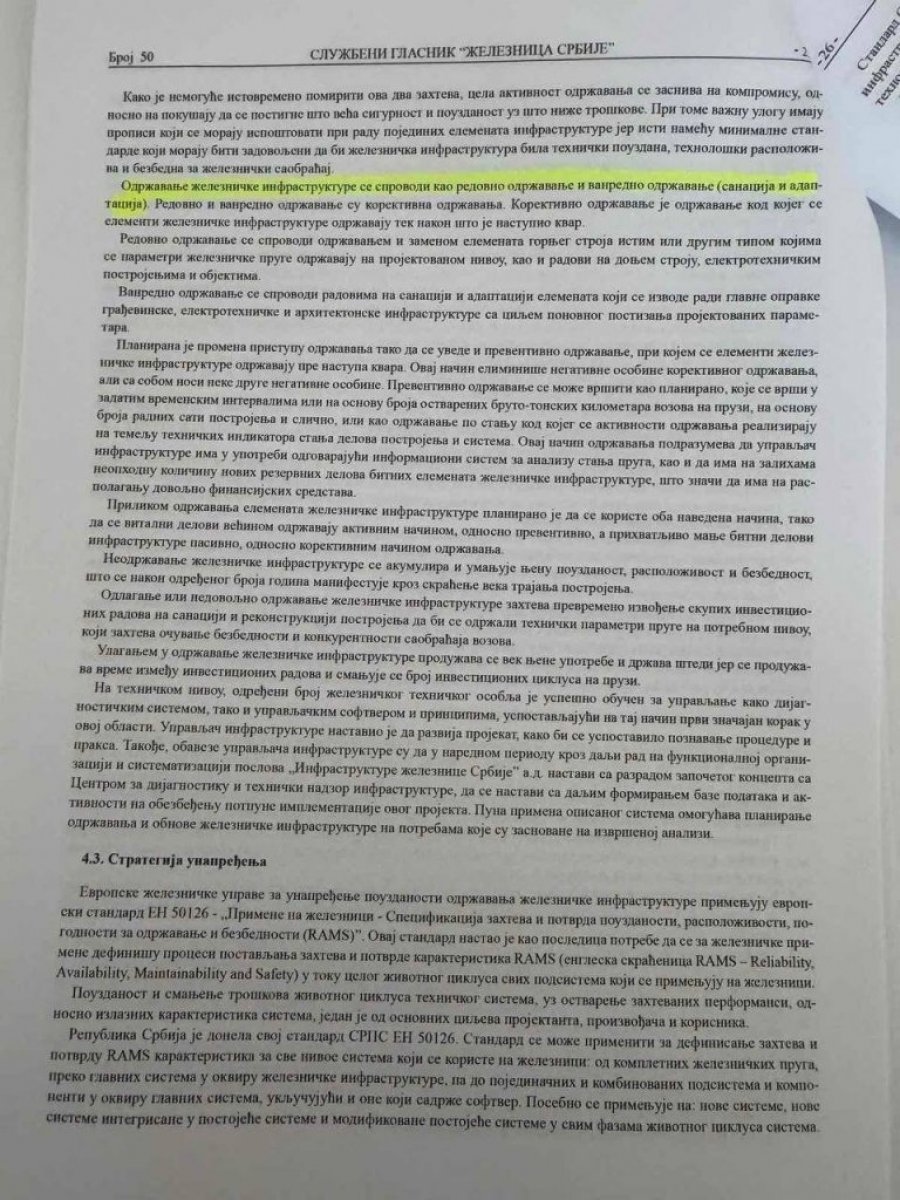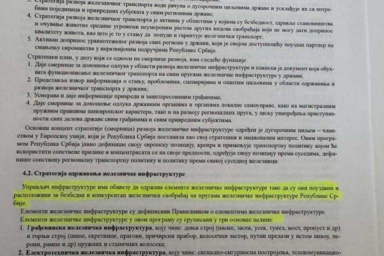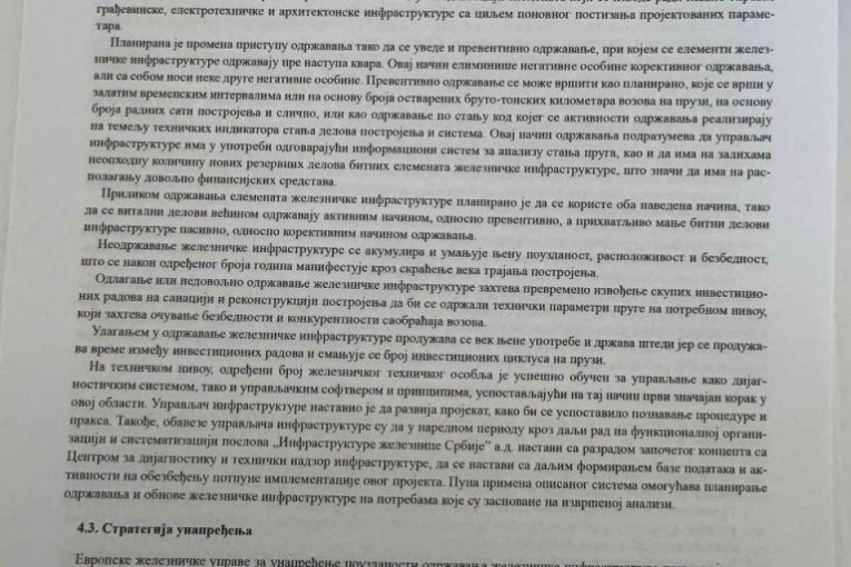 Na strani 50, u odeljku „Strategija održavanja železničke infrastrukture“, Bojović je definisao da „upravljač infrastrukture ima obavezu da održava elemente železničke infrastrukture tako da su oni pouzdani i raspoloživi za bezbedan i konkurentan železnički saobraćaj“. Pod tačkom 4, u delu „arhitektonska železnička infrastruktura“, određena je obaveza da kompanija održava „stanične zgrade“.