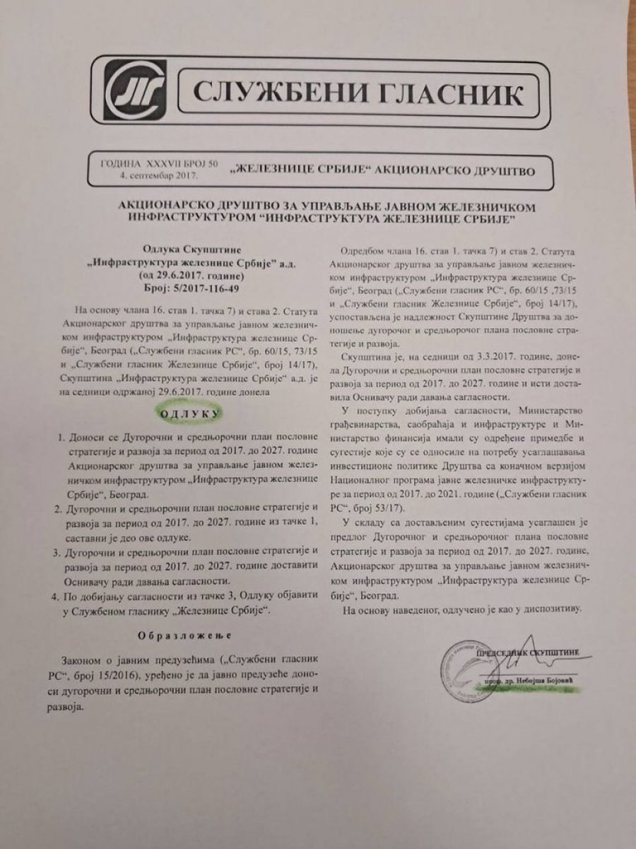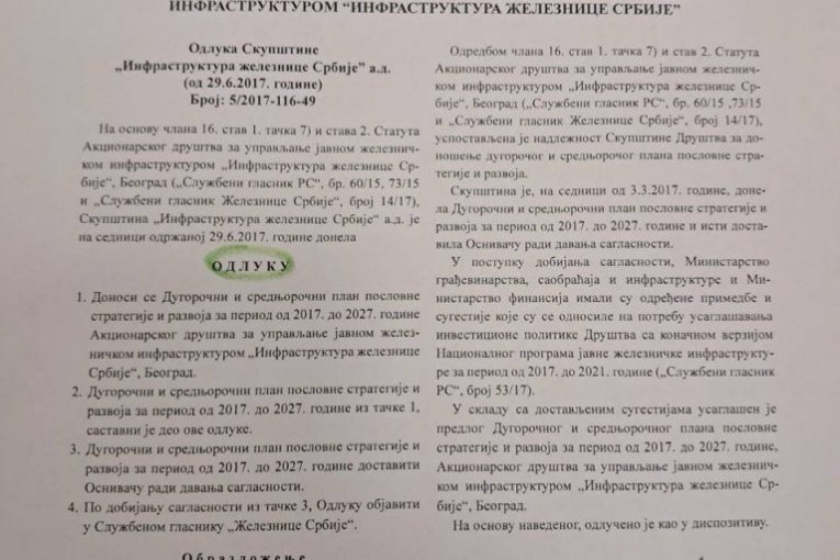 Nebojša Bojović, Đokićev prorektor i predsednik Skupštine akcionara kompanije Infrastruktura Železnica Srbije, potpisao je 29. juna 2017. godine Odluku broj 5/2017-116-49 kojom je usvojen „Dugoročni i srednjoročni plan poslovne strategije i razvoja kompanije Infrastruktura Železnice Srbije za period od 2017 – 2027. godine“, koji je još uvek na snazi.