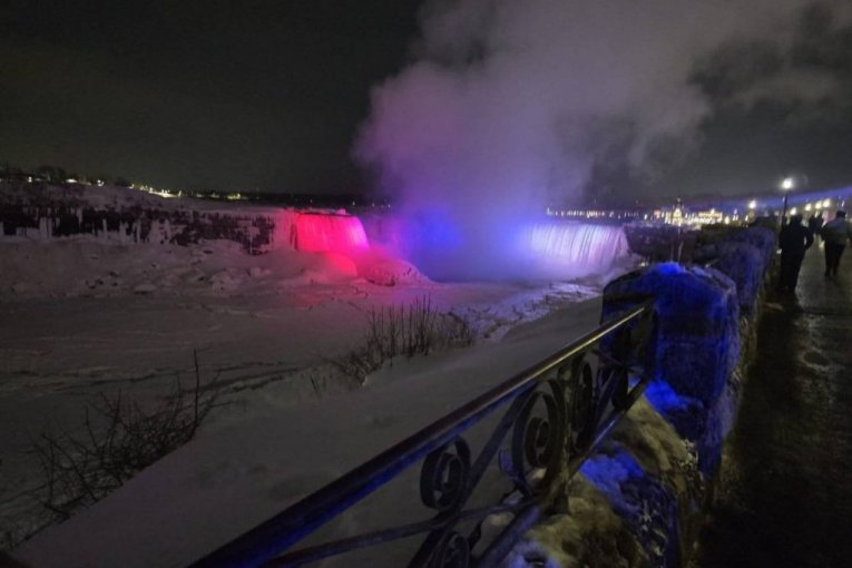Nijagarini vodopadi u Kanadi osvetljeni su danas u bojama srpske trobojke povodom Dana državnosti Srbije.