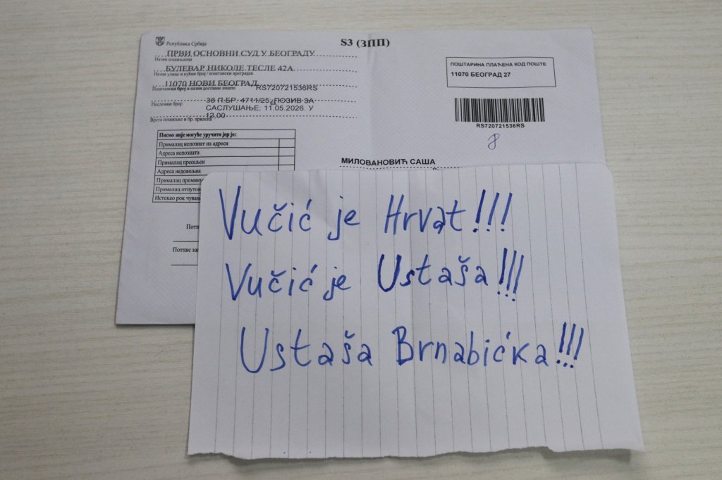 - U poštanskom sandučetu, gde mi svakodnevno stiže pošta, ostavljena je rukom napisana poruka u kojoj piše: "Vučić je Hrvat, Vučić je ustaša. Ustaša Brnabićka." Zanimljivo je da sanduče nije obeleženo mojim prezimenom. To može da zna samo poštar ili neko ko nadzire kada uzimam poštu. Poštar sigurno nije, čoveka poznajem. Dakle, neko prati šta radim i ostavlja mi ovakve poruke.