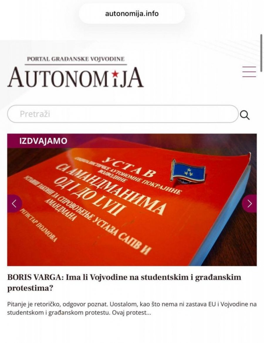 Na ovakav zaključak upućuje članak objavljen na Gruhonjićevom portalu "Automonija" koji potpisuje Boris Varga pod naslovom "Ima li Vojvodine na studentskim i građanskim protestima?".