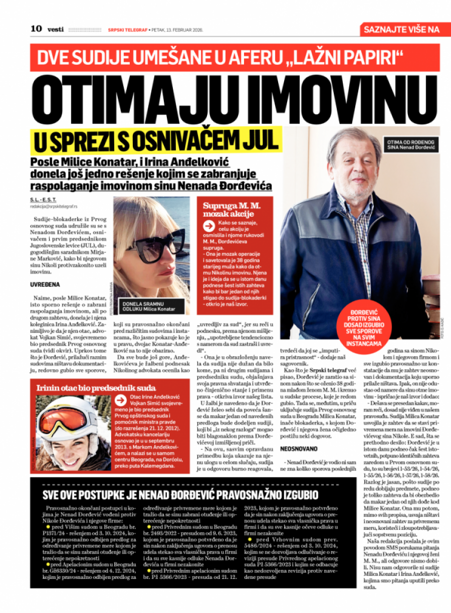 - Nenad Đorđević je vodio ni sam ne zna koliko sporova poslednjih godina sa sinom Nikolom i njegovom firmom i sve izgubio pravosnažno, uz konstatacije da mu je zahtev neosnovan i dokumentacija koju uporno prilaže ništava. Ipak, nije odustao od namere da sinu otme imovinu - ispričao je naš izvor.