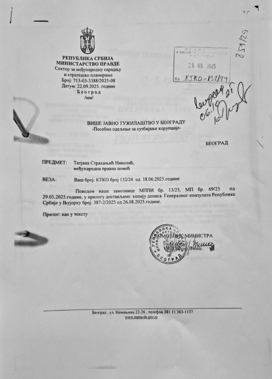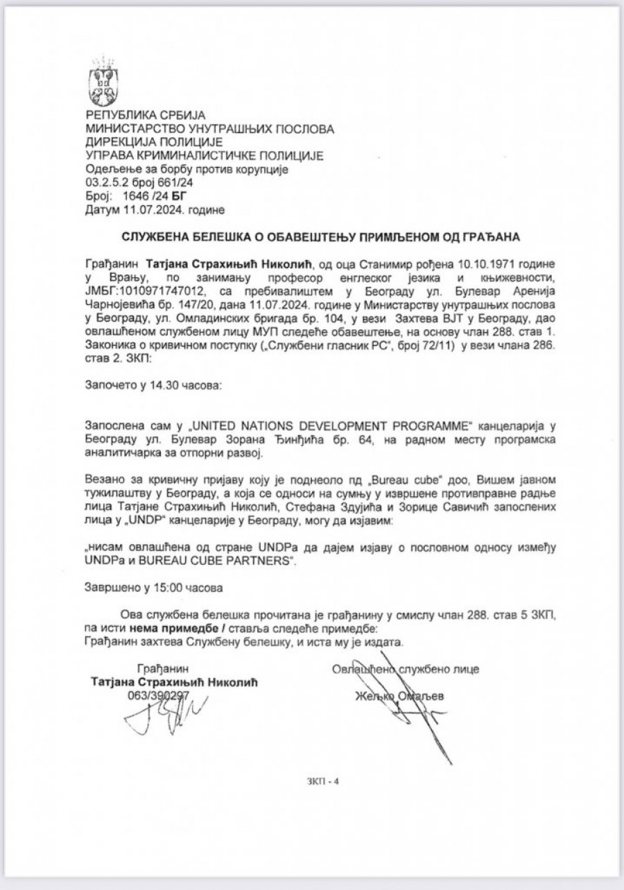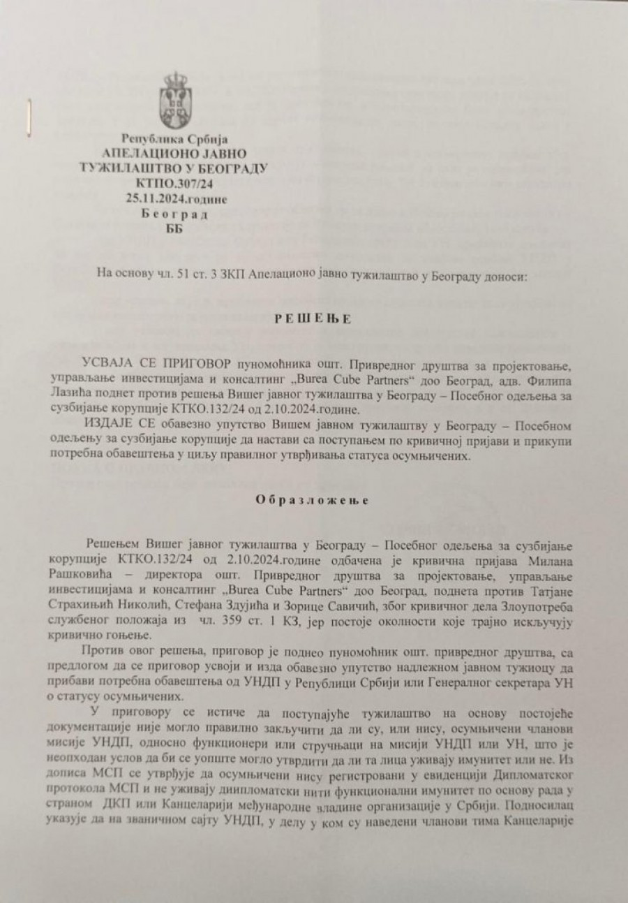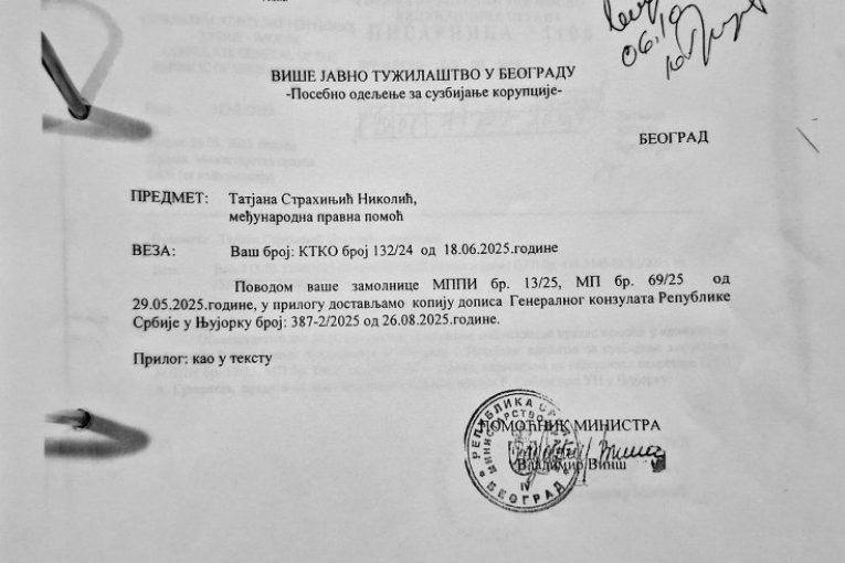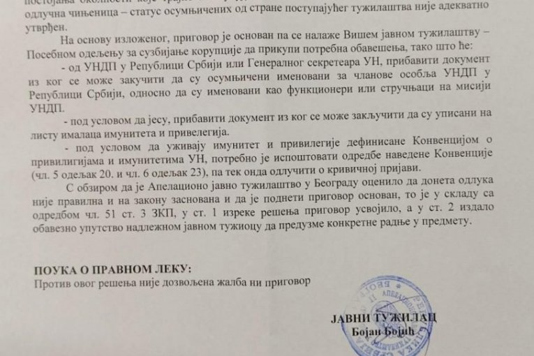 Više javno tužilaštvo u Beogradu, odnosno njegovo posebno odeljenje za suzbijanje korupcije, zatražilo je zvanično od UN, zamolnicom, preko našeg Ministarstva pravde i Generalnog konzulata Srbije u Njujorku, informacije o neposedovanju diplomatskog identiteta u slučaju troje službenika UNDP. Jasno je, naravno, da oni taj imunitet nemaju, ali je procedura takva, s obzirom na to da su odgovornost pokušali da izbegnu upravo pozivanjem na imunitet (nepostojeći).