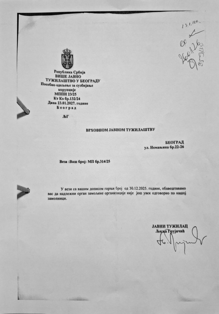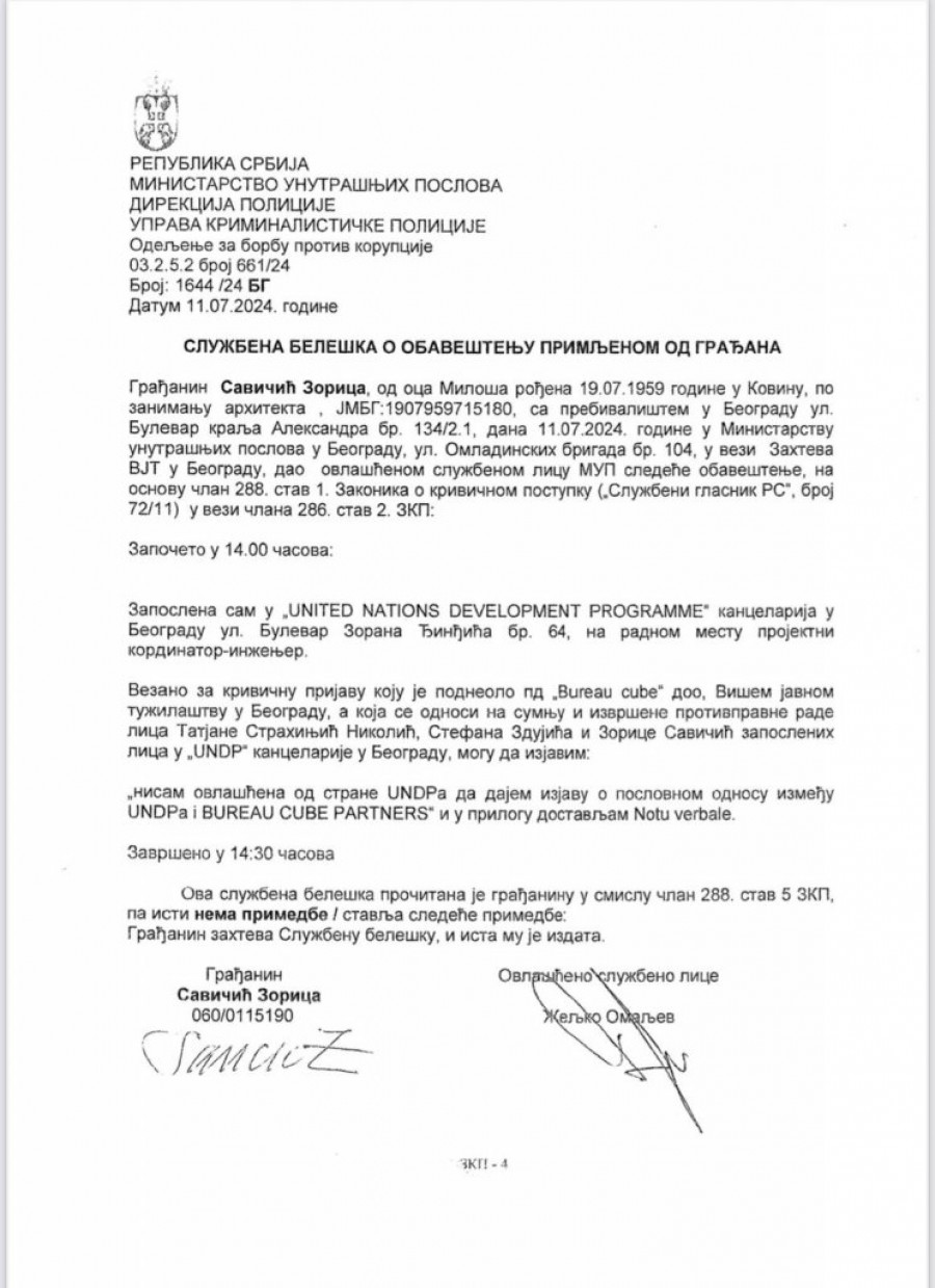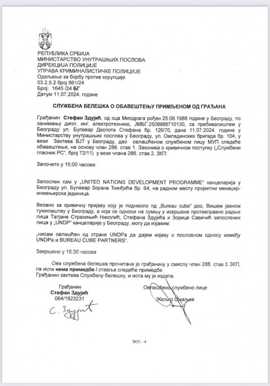 Više javno tužilaštvo u Beogradu, odnosno njegovo posebno odeljenje za suzbijanje korupcije, zatražilo je zvanično od UN, zamolnicom, preko našeg Ministarstva pravde i Generalnog konzulata Srbije u Njujorku, informacije o neposedovanju diplomatskog identiteta u slučaju troje službenika UNDP. Jasno je, naravno, da oni taj imunitet nemaju, ali je procedura takva, s obzirom na to da su odgovornost pokušali da izbegnu upravo pozivanjem na imunitet (nepostojeći).