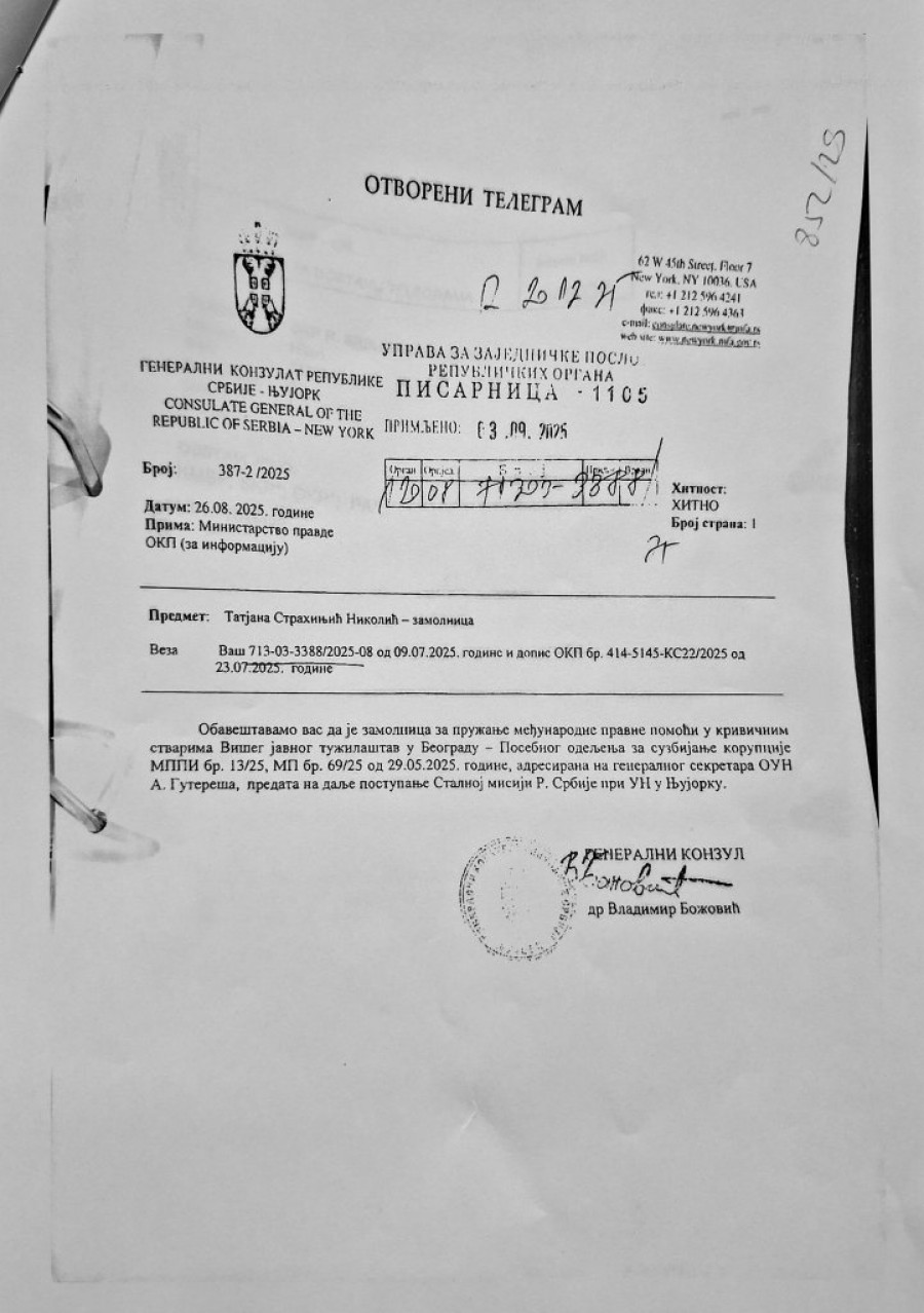 Iz Srbije je, kako saznaje Srpski telegraf, poslata još jedna urgencija ka administraciji Ujedinjenih nacija, čije je sedište u Njujorku, da nam što pre i formalno pošalju odgovor po zamolnici koja je poslata vezano za aferu "UNDP", kako bi istraga i procesuiranje odgovornih mogli da budu nastavljeni.