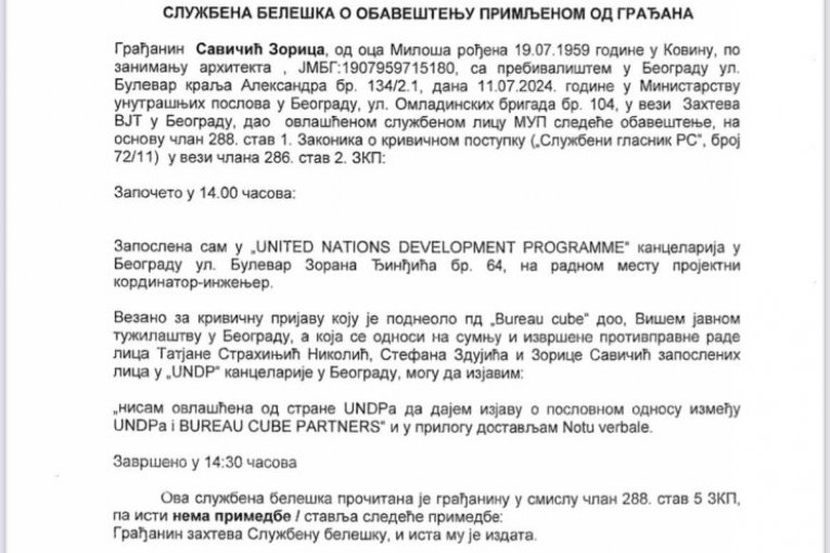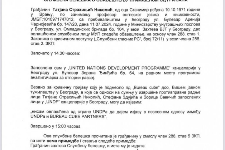 Mnogo je tekstova Srpski telegraf napisao o delovanju UNDP u Srbiji. Nije, naravno, za to kriv niko u centrali u Njujorku, već naši ljudi odavde. Ljudi koji imaju imena i prezimena i protiv kojih su podnete krivične prijave: Tatjana Strahinjić Nikolić, Stefan Zdujić i Zorica Savičić. Njihove, s mnogo osnova se sumnja, mutne radnje omogućio je čelni čovek kancelarije UNDP u Beogradu Jakup Beriš, koji, međutim, raspolaže diplomatskim imunitetom za razliku od troje prvopomenutih, pa je protiv njega ovde nemoguće voditi postupak.