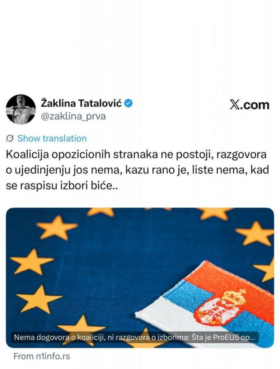 - Koalicija opozicionih stranaka ne postoji, razgovora o ujedinjenu još nema. Kažu "Rano je". Liste nema, kad se raspišu izbori biće... - napisala je ona na X.