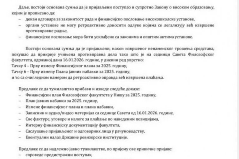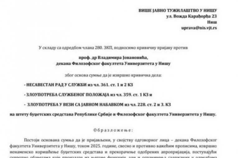 Savet za monitoring, ljudska prava i borbu protiv korupcije „Transparentnost“ podneo je krivičnu prijavu protiv Vladimira Jovanovića, dekana Filozofskog fakulteta u Nišu, zbog sumnje da je tokom 2025. godine novac iz budžeta fakulteta trošio nezakonito, nenamenski i mimo svih propisa.