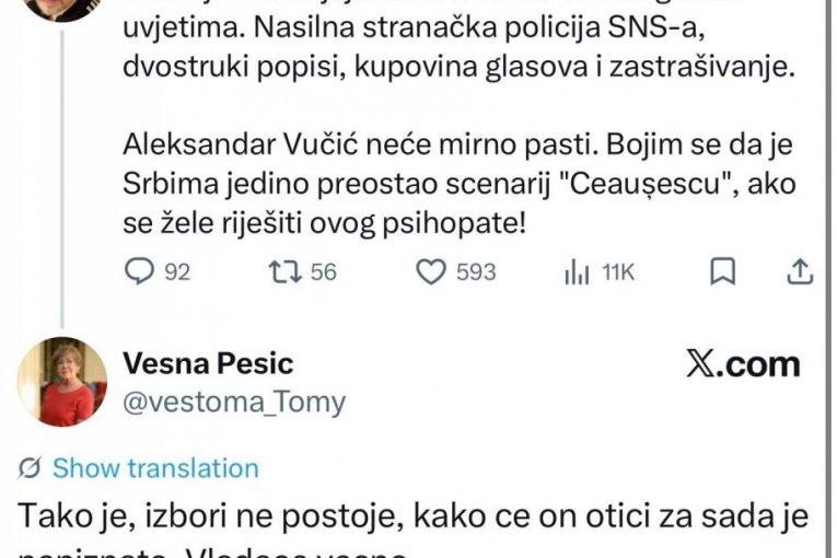Ovakva retorika, koja direktno asocira na nasilan kraj rumunskog lidera Nikolaea Čaušeskua, predstavlja opasan presedan u javnom prostoru, posebno što dolazi od univerzitetskog profesora iz regiona. A što je onda podržala sociolog i nekadašnja političarka Vesna Pešić, koja se saglasila s iznetim stavovima: