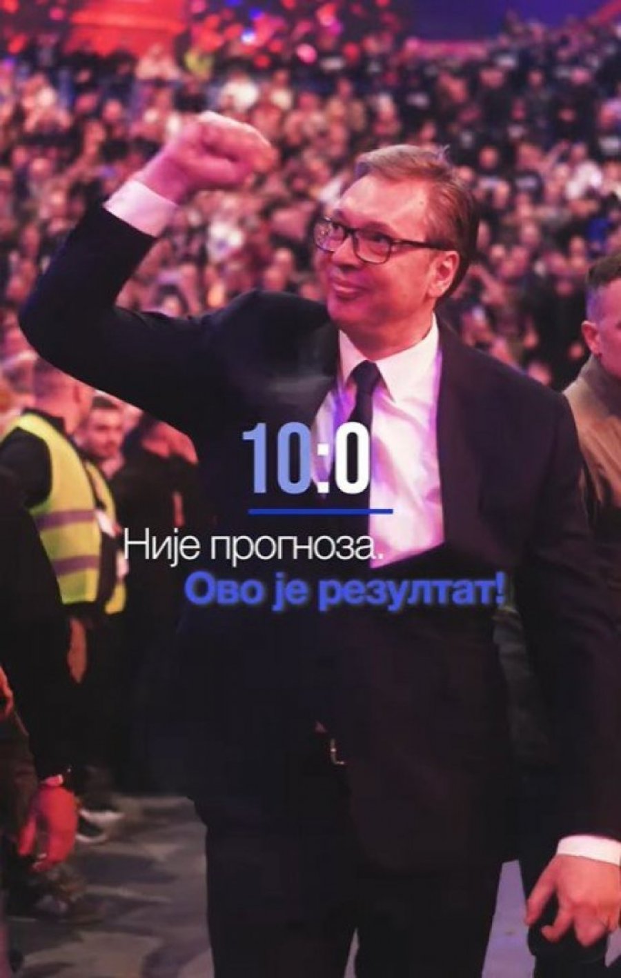 Predsednik je objavio snimak sa mitinga SNS iz Arene u kom se navodi: "10:0 Nije prognoza, to je rezultat", a u opisu objave naveo.