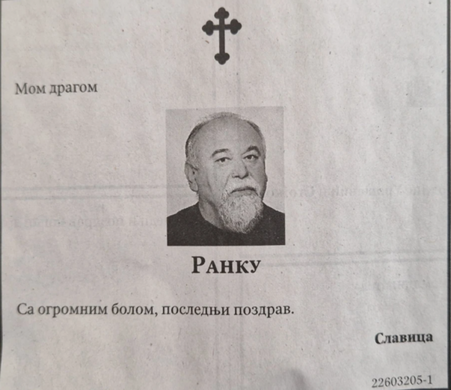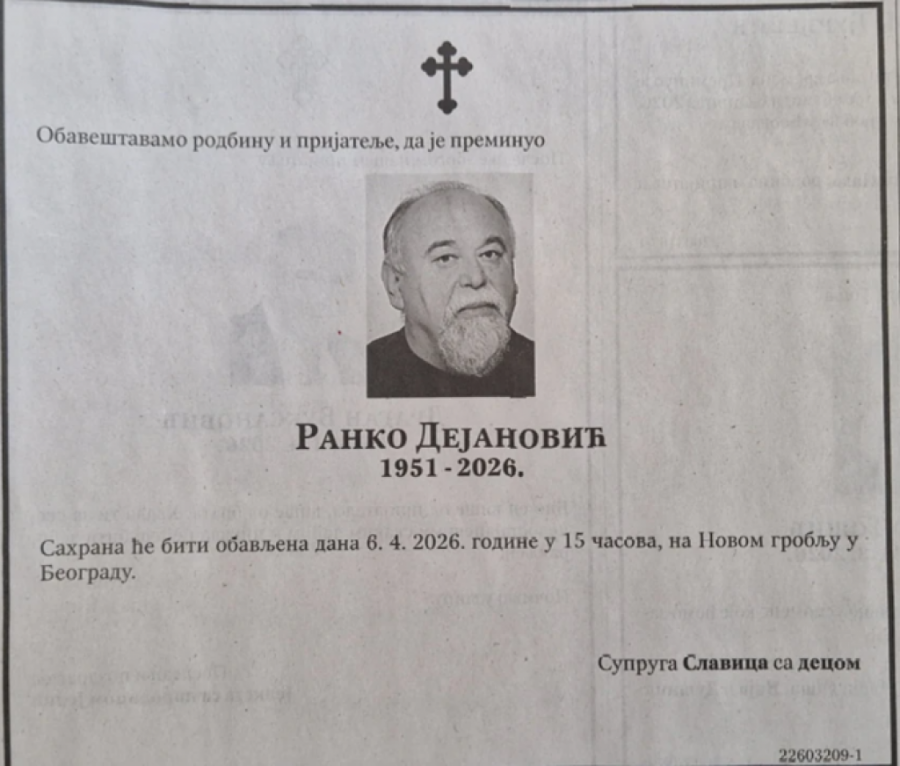 - Obaveštavamo rodbinu i prijatelje da je preminuo Ranko Dejanović. Sahrana će biti obavljena dana 6.4. 2026. godine u 15 časova na Novom groblju u Beogradu - stoji u čitulji koju je dala porodica.