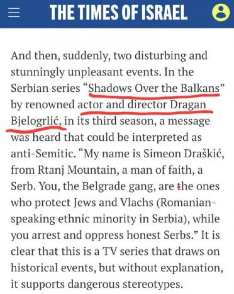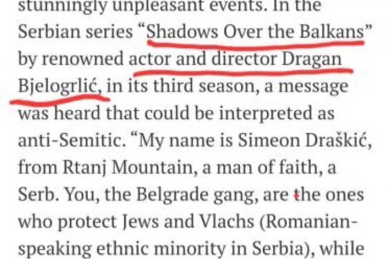 - I onda, iznenada, dva uznemirujuća i zapanjujuće neprijatna događaja. U srpskoj seriji "Senke nad Balkanom", poznatog glumca i reditelja Dragana Bjelogrlića, u trećoj sezoni, čula se poruka koja bi se mogla protumačiti kao antisemitska. "Ja sam Simeon Draškić, s planine Rtanj, čovek od vere, Srbin. Vi, beogradska bando, štitite Jevreje i Vlahe (rumunskogovornu etničku manjinu u Srbiji), dok hapsite i ugnjetavate poštene Srbe." Jasno je da je ovo TV serija koja se oslanja na istorijske događaje, ali bez objašnjenja, podržava opasne stereotipe - ističe Zurof.