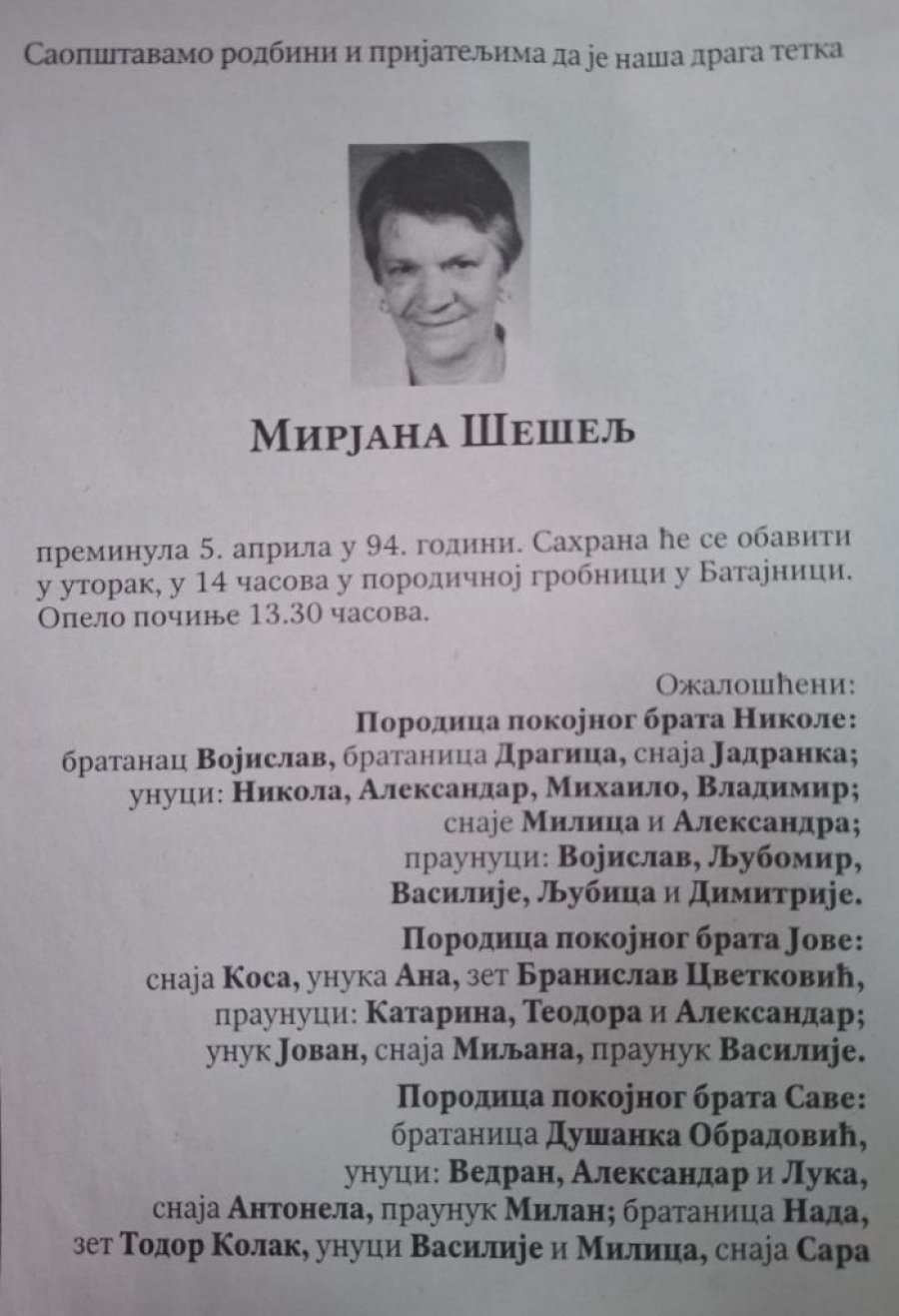 - Obaveštavamo rodbinu i prijatelje da je naša draga tetka Mirjana Šešelj preminula 5. aprila u 94. godini. Sahrana će se obaviti u utorak, u 14 časova u porodičnoj grobnici u Batajnici. Opelo počinje u 13.30 časova - piše u čitulji.