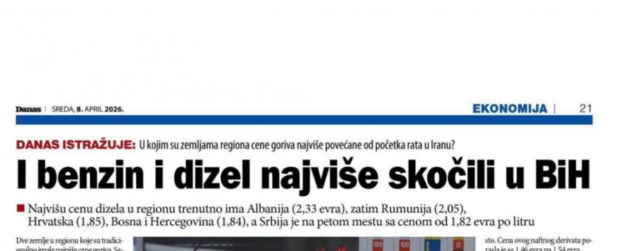 Podsećanja radi, krajem februara, pre početka sukoba na Bliskom istoku, cene su bile znatno niže. Dizel se tada kretao između 2,25 i 2,29 KM po litru, dok je benzin koštao od 2,25 do 2,32 KM.