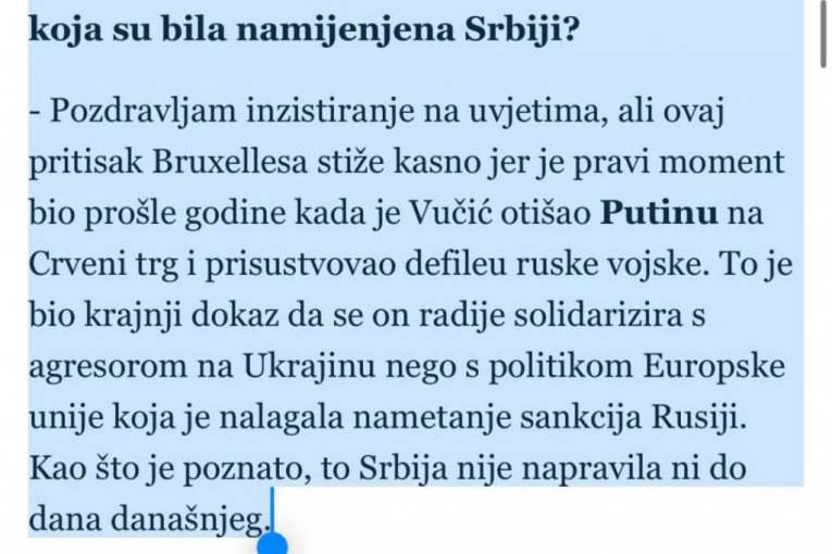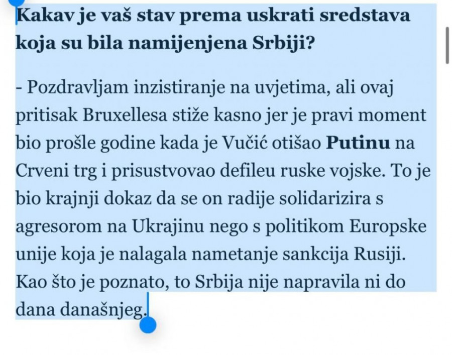 Ipak, Picula se nije zaustavio samo na mrežama. U intervjuu za hrvatski list „Jutarnji.hr“, otvoreno je podržao uskraćivanje sredstava Srbiji, navodeći da je pravi trenutak za pritisak bio prošle godine kada je Aleksandar Vučić prisustvovao paradi ruske vojske na Crvenom trgu. Po njegovom mišljenju, taj čin pokazuje veću solidarnost sa Moskvom nego sa politikom EU, što Srbiju, prema njegovim rečima, čini „odgovornom“ za neprimenjivanje sankcija Rusiji.