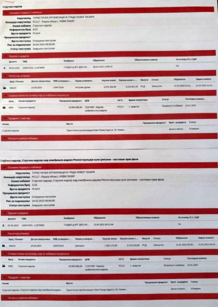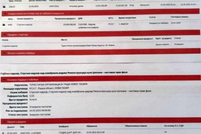 I to baš za poslove stručnog nadzora u vezi sa zaštitom kulturnih dobara koje je ona kao direktorka RZZSK prethodno odobravala. Jedan od primera su poslovi sklopljeni s Turističkom organizacijom Novog Pazara 24. aprila 2025, kad je "Studio D Art" zaključio dva ugovora ukupne vrednosti 5,5 miliona dinara. I to za posao stručnog nadzora na radovima na Crkvi Svetog Petra i Pavla, upisanoj na listu svetske baštine Uneska, za 3.210.427,20 dinara, kao i na kuli Džephana za 2.310.210 dinara. Oba objekta su pod zaštitom Republike Srbije kao spomenici kulture od izuzetnog značaja, a saglasnost za radove daje direktor RZZSK, u ovom slučaju Dubravka Đukanović.