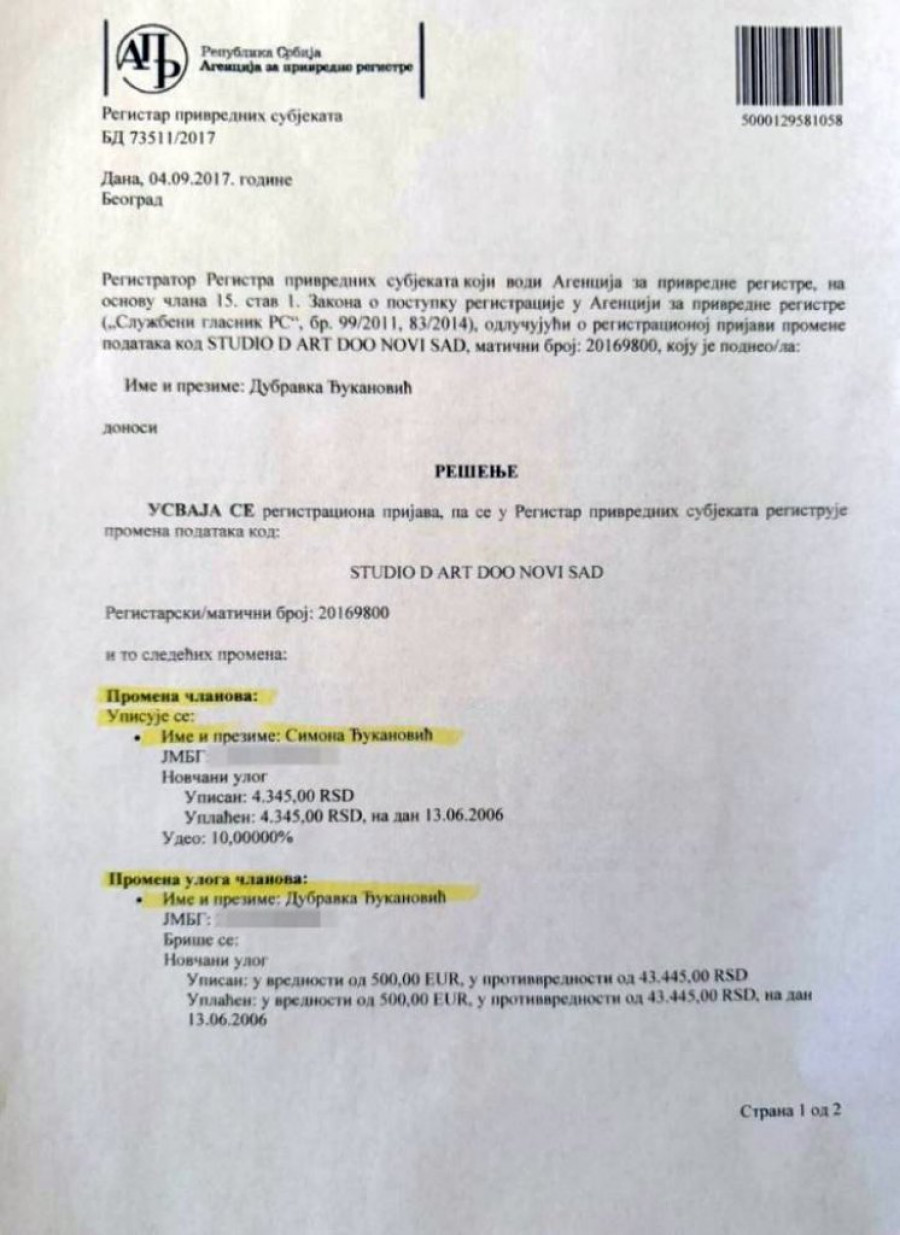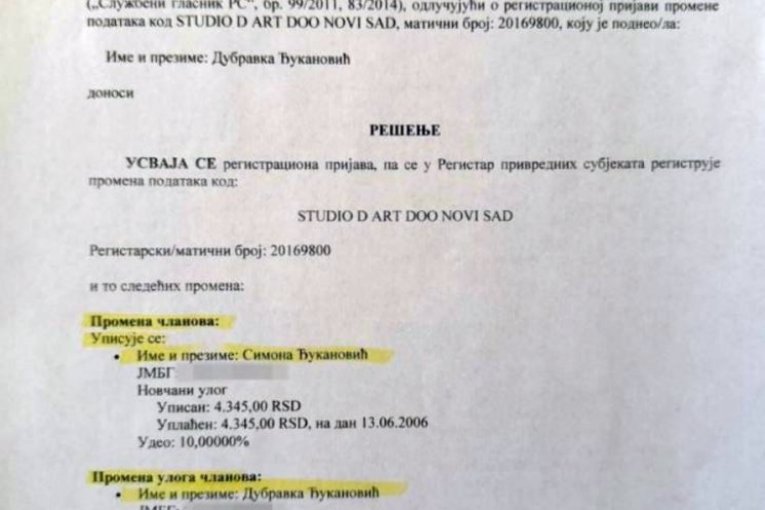 Naime, kako je naš list objavio još u januaru, za četiri godine na toj poziciji Đukanovićeva je preko firme svoje ćerke dobila iz državne kase oko 848.000 evra, a novosadska firma "Studio D Art" od 2021. do 2025. na javnim nabavkama zaključila je čak 26 ugovora u vrednosti od 99.084.067 dinara.