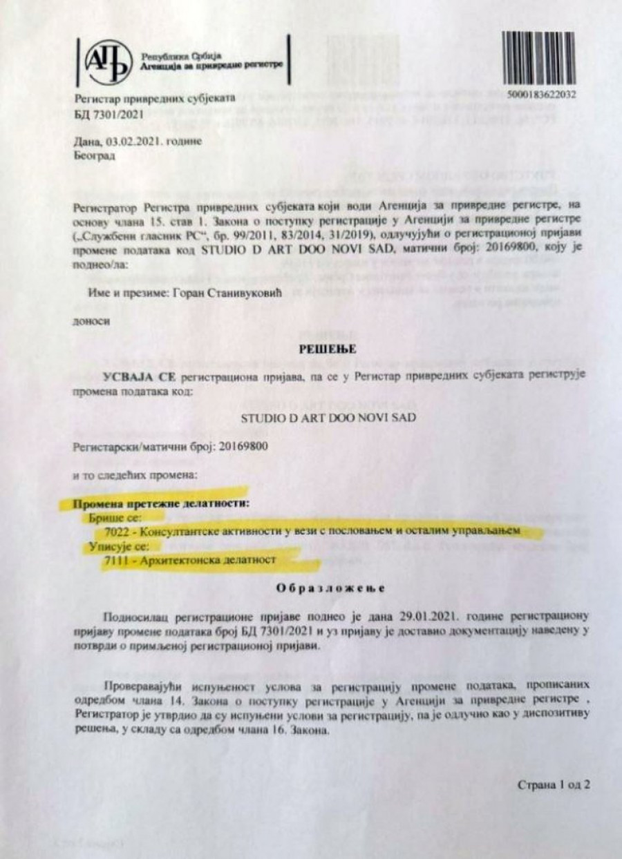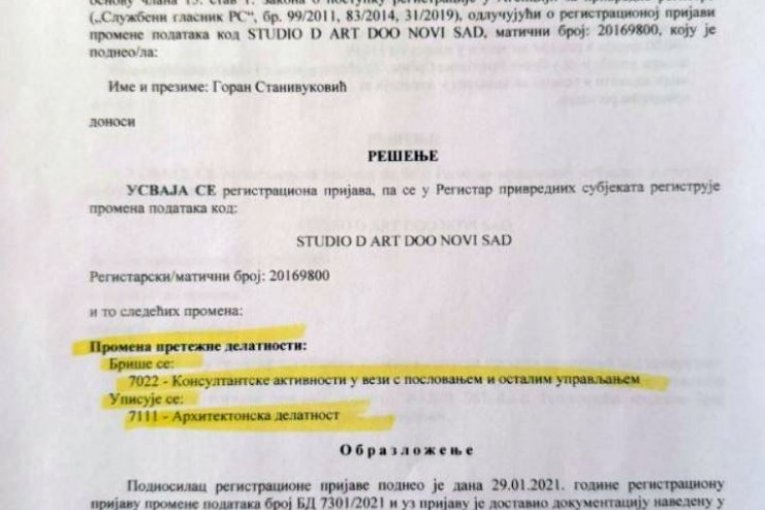 Podaci Agencije za privredne registre (APR) ukazuju da je "Studio D Art" 2021, kad je imenovana za direktora RZZSK, promenio delatnost iz konsultantskih aktivnosti u arhitektonske usluge. Takođe, Đukanovićeva je upravljačka prava "Studio D Art", čiji je ona vlasnik s 90 odsto, a ćerka Simona s 10 odsto, prenela upravo na naslednicu 3. februara 2021. Đukanovićeva je direktor RZZSK postala 14. januara te godine.