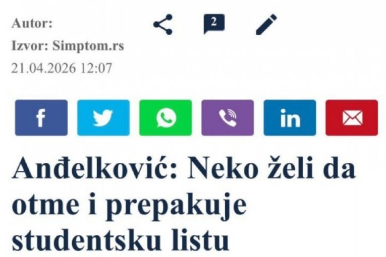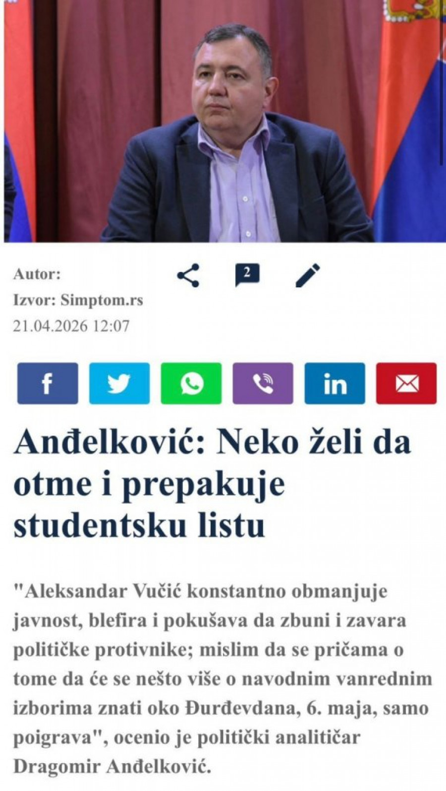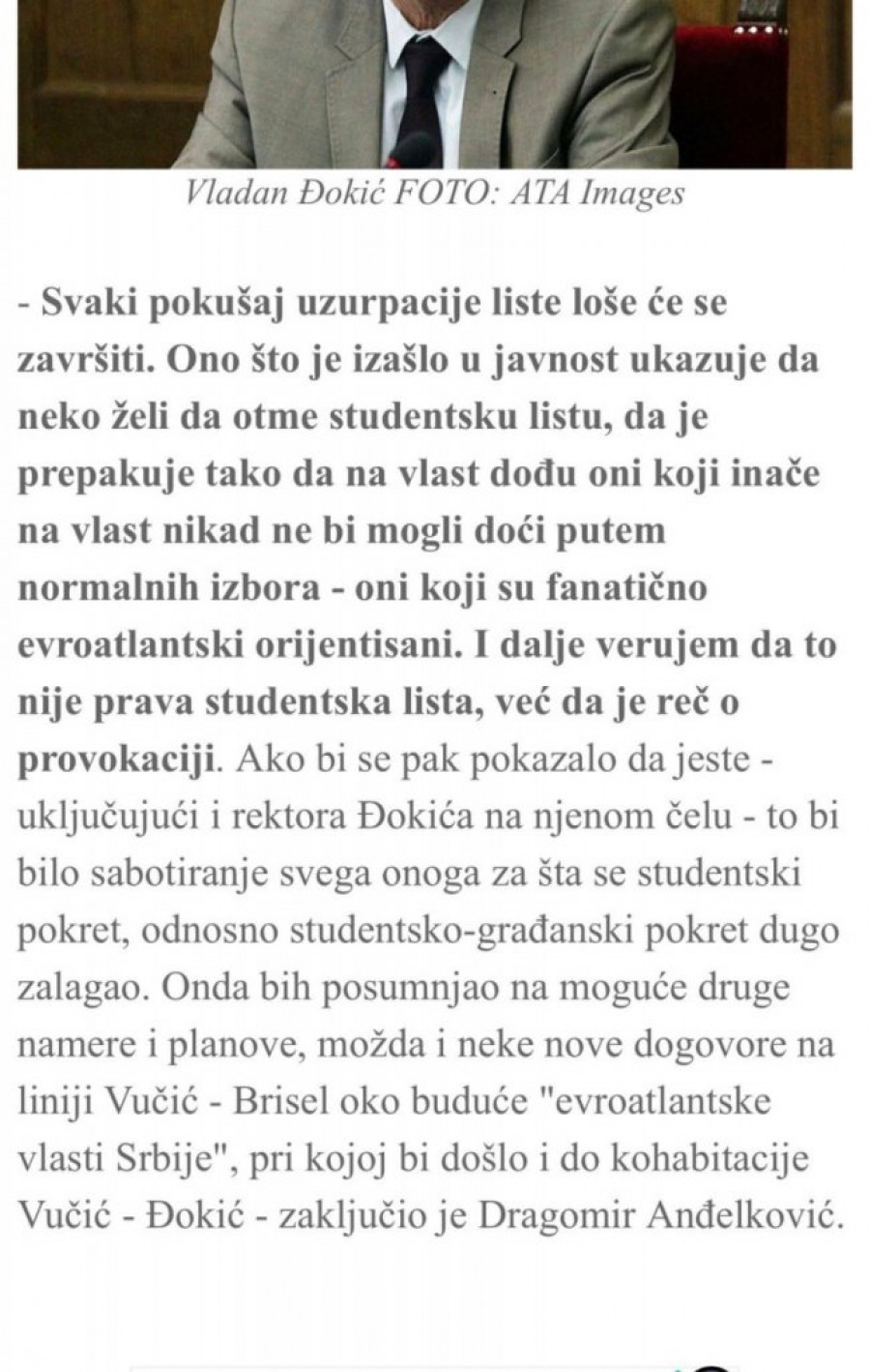 - Svaki pokušaj uzurpacije liste loše će se završiti. Ono što je izašlo u javnost ukazuje da neko želi da otme studentsku listu, da je prepakuje tako da na vlast dođu oni koji inače na vlast nikad ne bi mogli doći putem normalnih izbora - oni koji su fanatično evroatlantski orijentisani. I dalje verujem da to nije prava studentska lista, već da je reč o provokaciji. Ako bi se pak pokazalo da jeste - uključujući i rektora Đokića na njenom čelu - to bi bilo sabotiranje svega onoga za šta se studentski pokret, odnosno studentsko-građanski pokret, dugo zalagao. Onda bih posumnjao na moguće druge namere i planove, možda i neke nove dogovore na liniji Vučić-Brisel oko buduće "evroatlantske vlasti Srbije", pri kojoj bi došlo i do kohabitacije Vučić-Đokić - zaključio je Dragomir Anđelković.