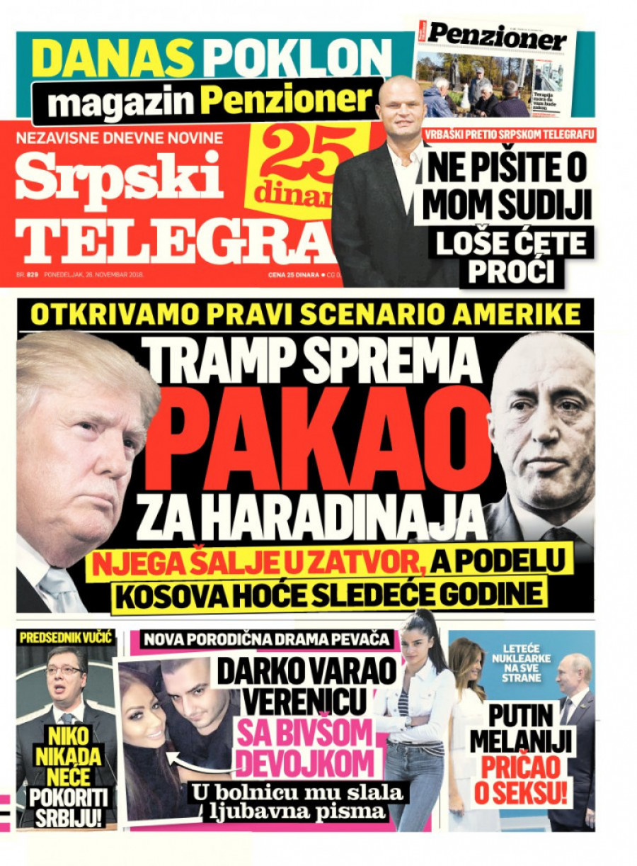 O svemu ovome kao i o tome šta Vučić kaže o pokoravanju Srbije i šta je Putin pričao Melaniji, pročitajte više u sutrašnjem izdanju "Srpskog telegrafa" za 26. novembar kao i na portalu "Republika".