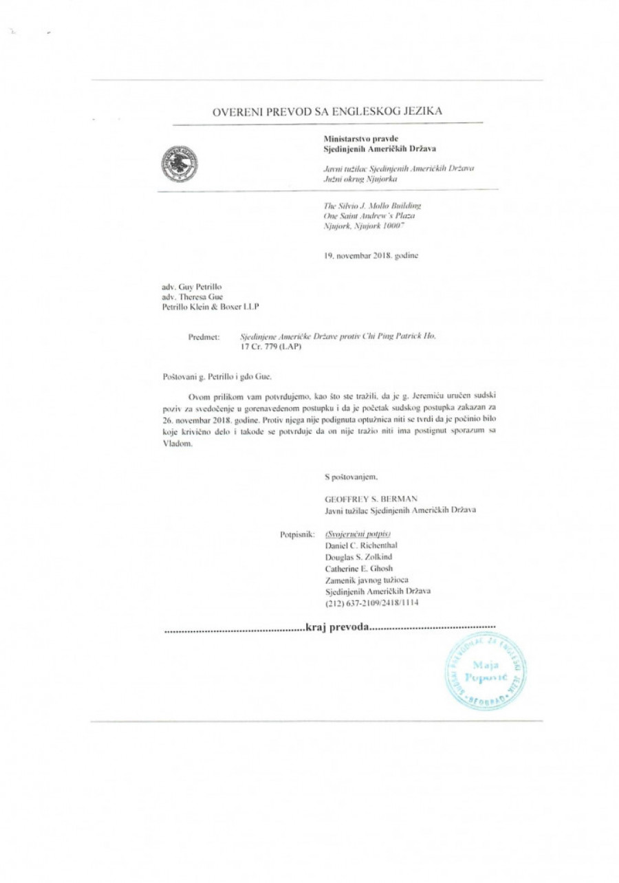 To nedvosmisleno stoji u pismu upućenom od strane nadležnog državnog tužioca Džefrija Bermana, koje dostavljam vašem listu na uvid i objavljivanje.