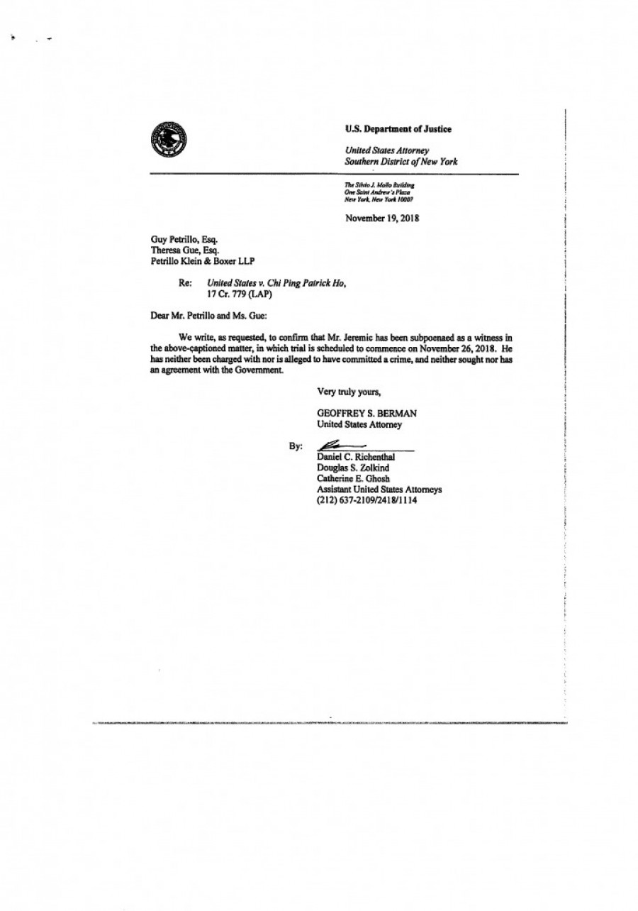 Istraga američkih organa ni u jednom trenutku nije usmerena protiv mene. U pismu se precizno navodi da nisam optužen, niti osumnjičen, kao i da nemam, i da nikada nisam tražio bilo kakvu nagodbu sa američkim vlastima, te da ću se pojaviti isključivo kao svedok tužilaštva na suđenju bivšem ministru unutrašnjih poslova Hong Konga Patriku Hou, koje počinje 26. novembra u Njujorku.