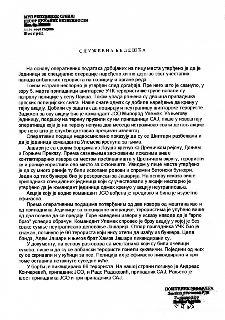 - Pre nego što je svanulo u zoru 5. marta, pripadnici šiptarske UČK, terorističke grupe, napala je patrolu policije u selu Lauša. Tokom upada ranjena su dvojica pripadnika srpskih policijskih snaga. Naše snage odmah su dobile naređenje da krenu u tajnu akciju. Dobili su zadatak da lociraju i neutrališu šiptarske teroriste. Zadužen za ovu akciju bio je komandant JSO Milorad Ulemek. Uz njegovu jedinicu, podršku na terenu pružili su im pripadnici SAJ - piše u izveštaju operativca koji je je na terenu nepuna dva meseca istraživao svaki detalj akcije pre nego što je službi dostavio precizan izveštaj.