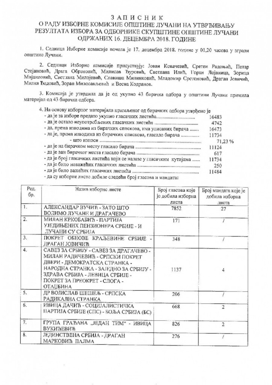 Zapisnik Opštinske izborne komisije u Lučanima, posle kojih je opozicija iznela primedbe na njihovu regularnost, usvojen je bez primedbi, pa i predstavnika opozicionog Saveza za Srbiju u tom telu.