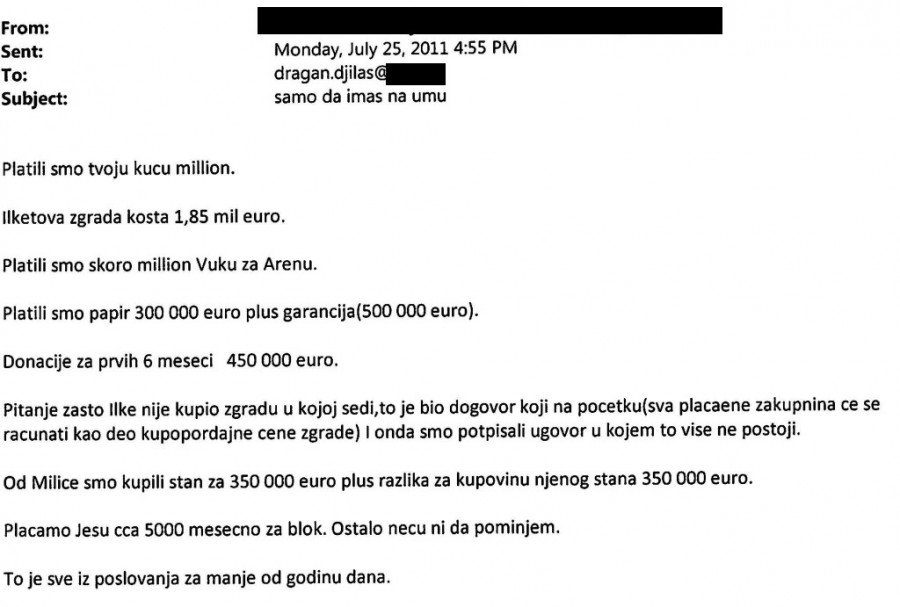 Foto: Srpski telegrafObrtao se ogroman novacPod naslovom "Samo da imaš na umu" Đilasova najbliža saradnica iz "Multikoma" šalje svom šefu mejl iz kog se vidi na šta je sve kompanija davala pare. Između ostalog, podseća ga da su za njegovu kuću platili milion evra. U ovom dopisu pominje mnogobrojne milionske poslove u kojima se, evidentno, obrtao ogroman novac. Za sve to vreme, podsetimo, Đilas obavlja funkciju gradonačelnika Beograda. |