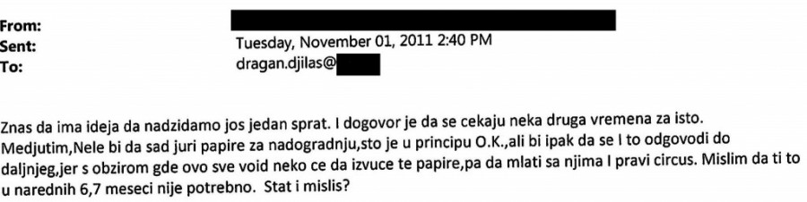 Foto: Srpski telegrafDaj da nadzidamo jedan spratGradonačelnik može i da nadzida gde hoće i koliko hoće, mislio je Đilas dok je bio u toj fotelji. O tome svedoči još jedan mejl u nizu koji mu šalje šefica njegove firme u to vreme. Ona mu saopštava da postoji ideja da se neka zgrada nadzida za jedan sprat, ali predlaže da za to ipak sačeka nekoliko meseci kako "neko ne bi mahao papirima" i tako mu politički naškodio. |