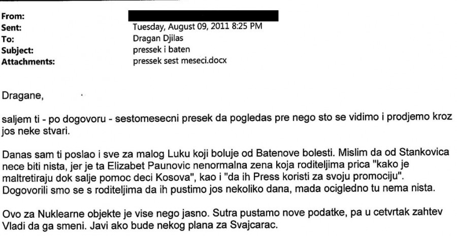 U ovoj prepisci, u kojoj se pominju konkretna imena ljudi i firmi protiv kojih treba pisati tekstove, govori se i o tome da će se "u četvrtak na Vladi tražiti smena direktora preduzeća 'Nuklearni objekti'". |