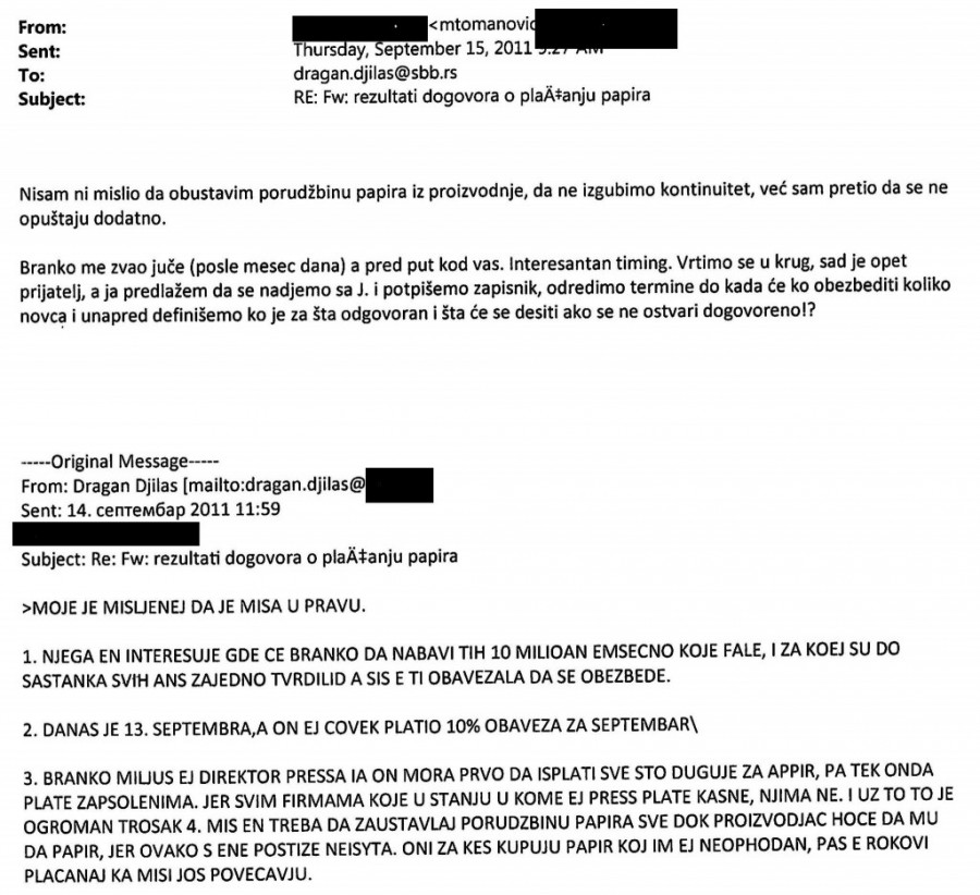 Foto: Srpski telegrafPrvo papir, onda dajte ljudima plateĐilas ni do danas nije priznao da je bio vlasnik dnevnog lista Press, zajedno sa Miroslavom Miškovićem, međutim, on se bukvalno na dnevnom nivou bavio poslovanjem tih novina. To se jasno vidi iz mejlova u kojima se govori o nabavci papira, dugovanjima Pressa, isplati zarada zaposlenima... |