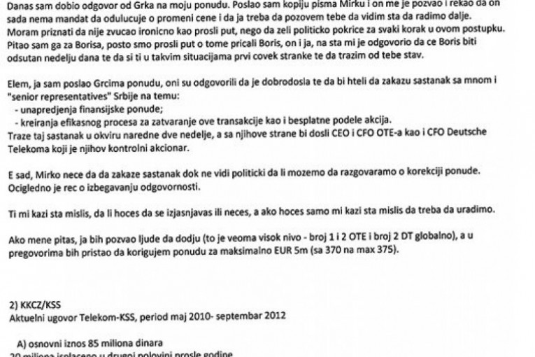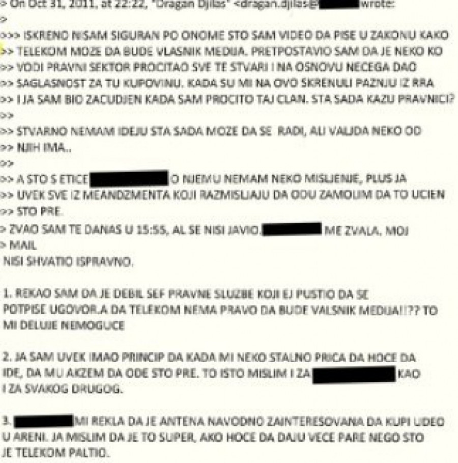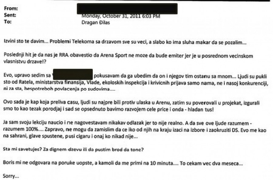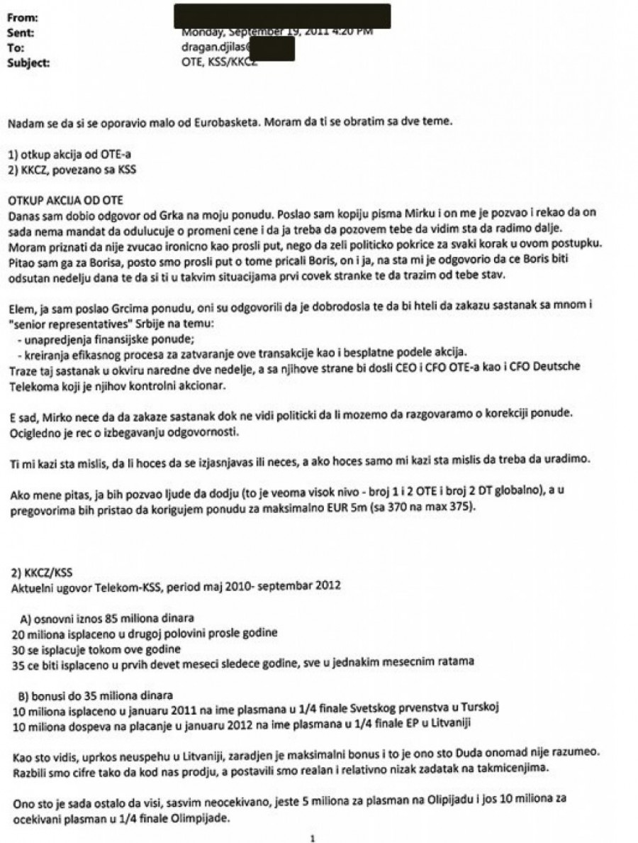 Iz prepiske koju objavljujemo jasno se vidi da je Đilas aktivno učestvovao u radu "Telekoma", kadriranju u toj kompaniji, njihovim investicijama, kupovini Arene, kupovini deonica od Grka... Vidi se i kako su "Telekomovi" milioni deljeni sportskim klubovima i savezima.