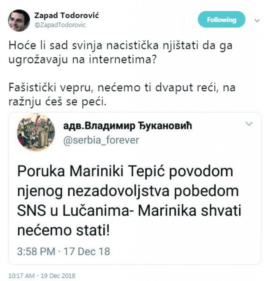Milinović, koji se na Tviteru predstavlja kao Zapad Todorović, bezobzirno skrnavi sve što ima veze sa srpskim narodom, tradiciju, praznike, manastire, svece, ali podjednako i aktuelnu vlast. A Danas je u jučerašnjem broju intervju s njim plasirao kao jedan od nosećih tekstova, pod naslovom "Moje hapšenje zbog tvita je politička svinjarija". Oglasili su se i Nezavisno udruženje novinara Srbije (NUNS) i Nezavisno društvo novinara Vojvodine (NDNV), ocenjujući da privođenje Milinovića predstavlja demonstraciju političke sile i još jedan dokaz da su policija i tužilaštvo batina u rukama SNS.
