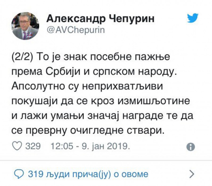 Ruski ambasador Aleksandar Čepurin poručio je danas da su apsolutno neprihvatljivi pokušaji da se kroz izmišljotine i laži umanji značaj nagrade ordena Aleksandra Nevskog, koju će ruski predsednik Vladimir Putin uručiti predsedniku Srbije Aleksandru Vučiću. Čepurin je naveo kako time žele da izokrenu očigledne stvari.