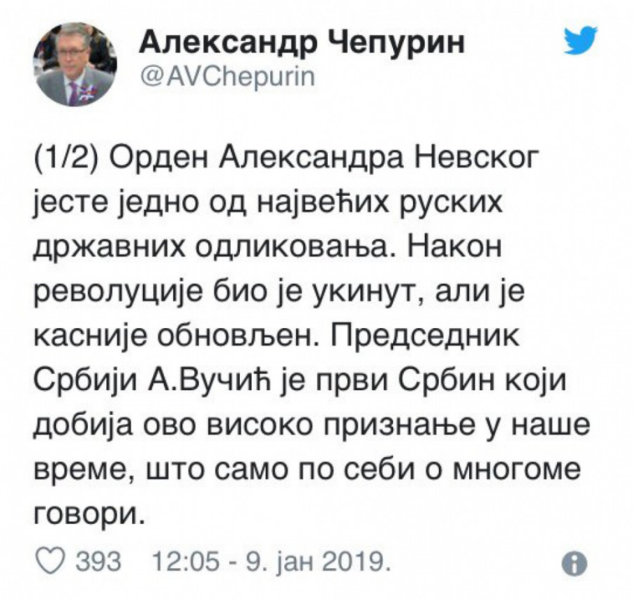 Orden Aleksandra Nevskog jeste jedno od najvećih ruskih državnih odlikovanja. Nakon revolucije bio je ukinut, ali je kasnije obnovljen. Predsednik Srbiji A.Vučić je prvi Srbin koji dobija ovo visoko priznanje u naše vreme, što samo po sebi o mnogome govori. To je znak posebne pažnje prema Srbiji i srpskom narodu.