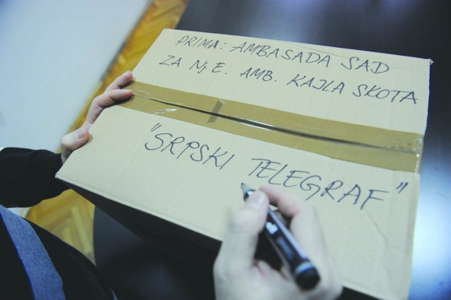 On se zatim vratio u zgradu. Posle nekih 15 minuta čekanja ispred ulaza, dvoje službenika ambasade, Amerikanaca koji govore srpski, izašlo je sa zahtevom da se kutija otpakuje. To smo i učinili.