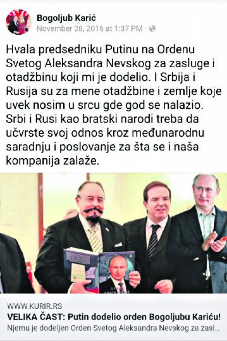 Bogoljub Karić se, podsetimo, 28. novembra 2016. na svom Fesjbuk profilu pohvalio visokim priznanjem i zahvalio šefu ruske države.