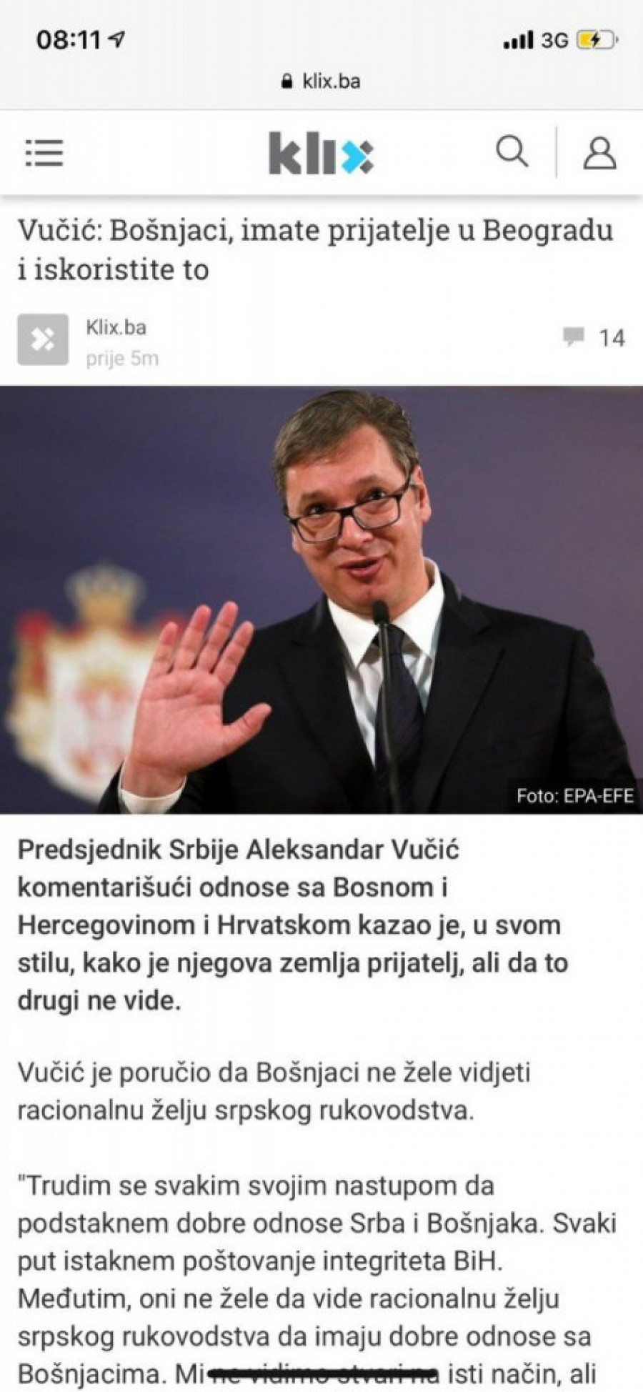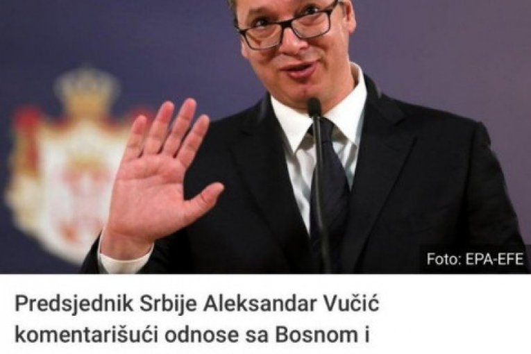 - Trudim se svakim svojim nastupom da podstaknem dobre odnose Srba i Bošnjaka. Svaki put istaknem poštovanje integriteta BiH. Međutim, oni ne žele da vide racionalnu želju srpskog rukovodstva da ima dobre odnose s Bošnjacima. Mi ne vidimo stvari na isti način, ali to ne znači da ne želimo BiH kao partnera. Imate prijatelje u Beogradu, u Srbiji, iskoristite to. Međutim, ne očekujte da u svemu budemo saglasni - rekao je Vučić.