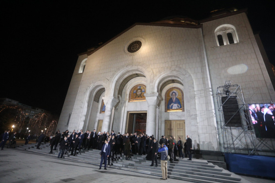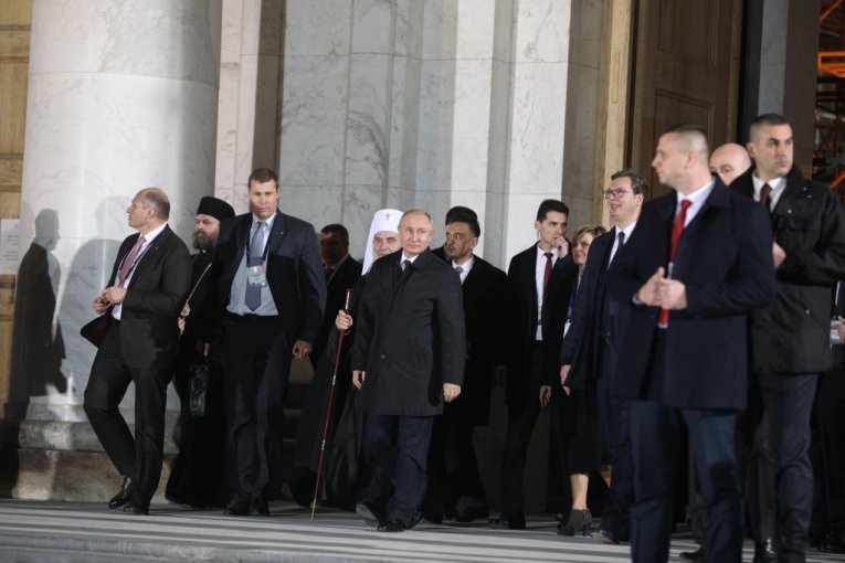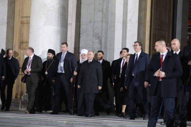 Predsednici Srbije i Rusije, Aleksandar Vučić i Vladimir Putin, obišli su večeras u pratnji patrijaraha Irineja, Hram Svetog Save i simbolično postavili kockice u mozaik sa likom Isusa Hrista i potpisali na fresku sa njegovim likom.
